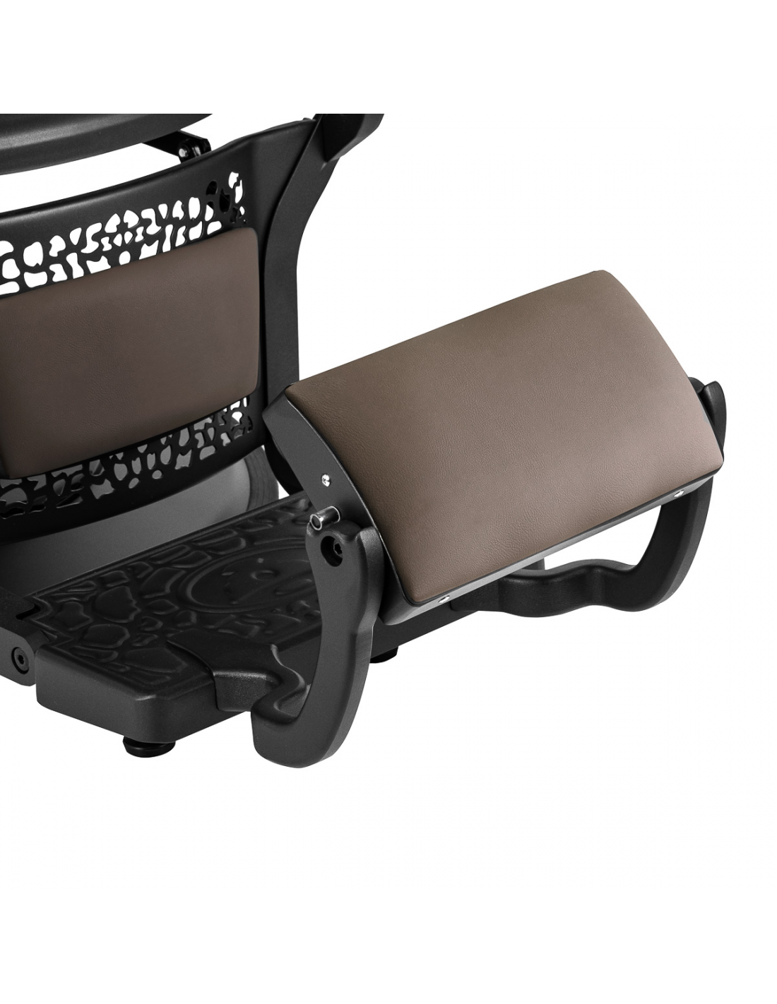 Komfortowe siedzisko wypełnione pianką gwarantuje klientowi wygodę w trakcie różnorodnych usług. Wyprofilowane oparcie pozwala na zajęcie dogodnej pozycji, zapewniając doskonałe wsparcie pleców, co jest istotne szczególnie podczas dłuższych zabiegów. Wyposażenie fotela w mechanizm pełnego obrotu sprawia, że praca staje się bardziej efektywna i wygodna. Tapicerowane podłokietniki umieszczone na odpowiedniej wysokości umożliwiają prawidłowe ułożenie barków klienta – sprawia to, że nie chowa głowy w ramionach ani się nie garbi – znacząco ułatwiając wykonywanie precyzyjnych zabiegów. Uchwyt na ręcznik pod podłokietnikiem znacznie wpływa na efektywność pracy. Otwór pomiędzy oparciem a siedziskiem ułatwia zachowanie czystości w salonie, pozwalając w łatwy sposób wymieść włosy z każdego zakamarka fotela. Usprawnia to przygotowanie stanowiska pracy pomiędzy klientami.