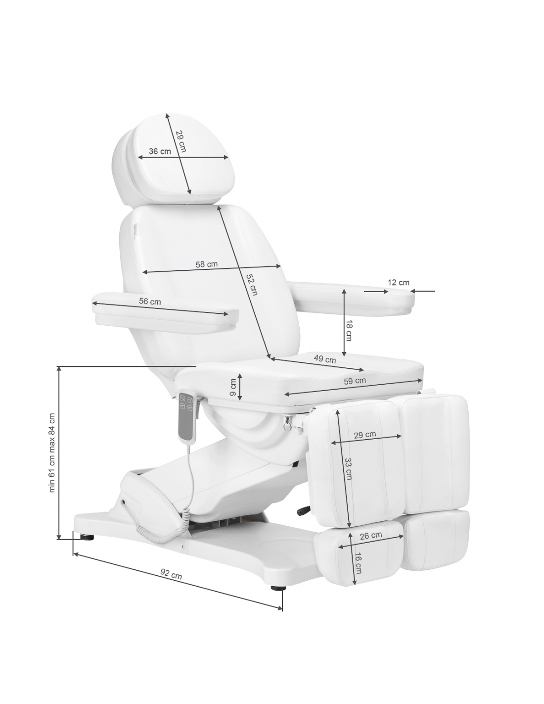 Przy użyciu prostego w obsłudze pilota fotel płynnie dostosowuje się w 2 płaszczyznach – posiada regulację wysokości oraz oparcia. Siedzisko można ustawić tak, by znajdowało się na wysokości od 61 cm do 84 cm, a przy całkowitym rozłożeniu fotel osiąga długość 2 m. Wymiary te pozwalają na łatwe korzystanie ze sprzętu osobom o różnym wzroście i umożliwiają dostosowanie go do aktualnie wykonywanego zabiegu oraz indywidualnych potrzeb, co wpływa zarówno na komfort użytkownika, jak i osoby wykonującej usługi. Uchwyty znajdujące się po obu stronach siedziska pozwalają na odwieszenie pilota tak, by znajdował się zawsze pod ręką.