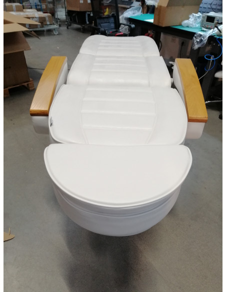 Pełne sterowanie pilotem doskonale ułatwia pracę. Poszycie fotela łatwo zmywalne, wykonane z eko-skóry spełniające rygorystyczne wymogi UE. Dodatkowo podłokietniki wykończone są drewnem, łatwo demontolwalne w razie potrzeby, a otwór w zagłówku pozwala na wykonywanie masażu.