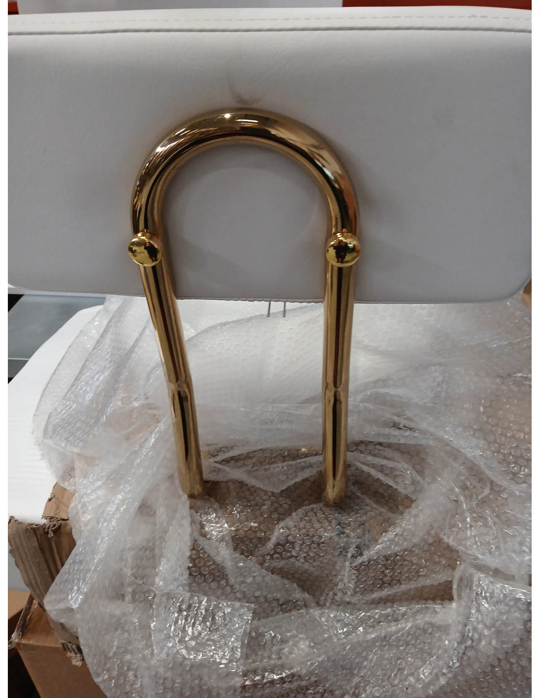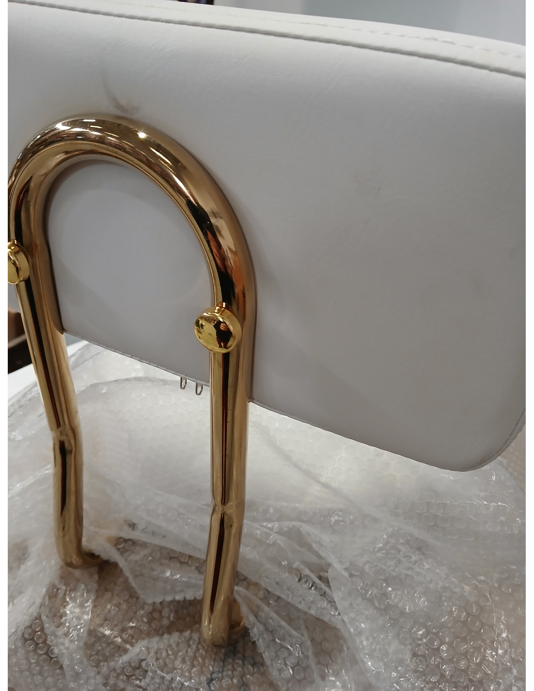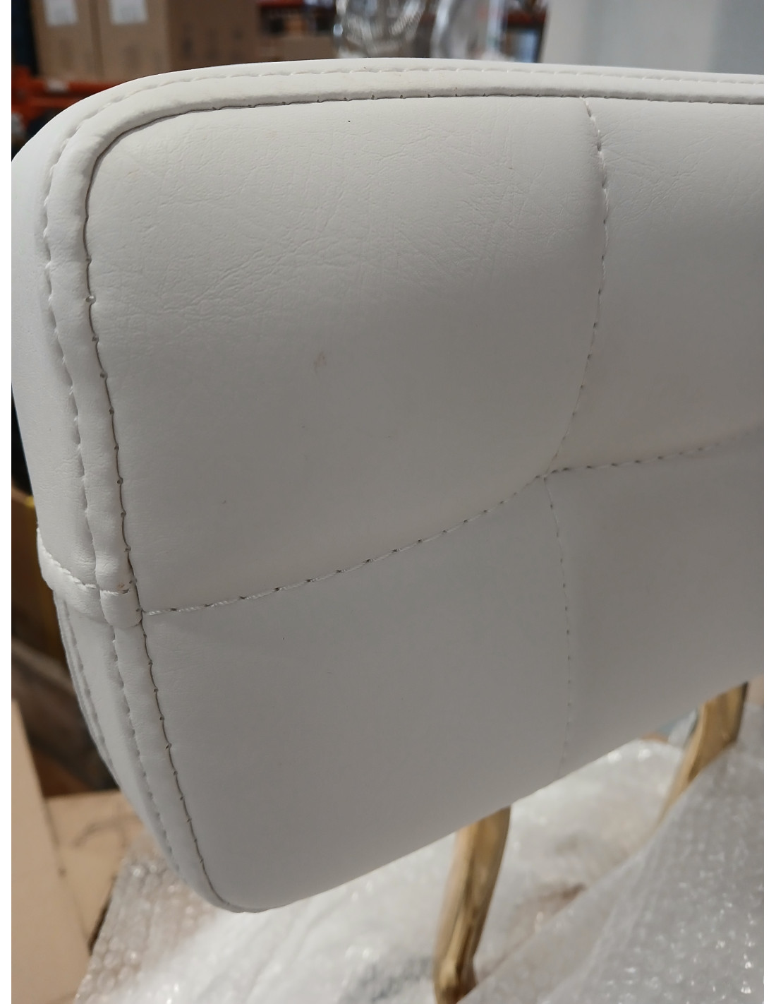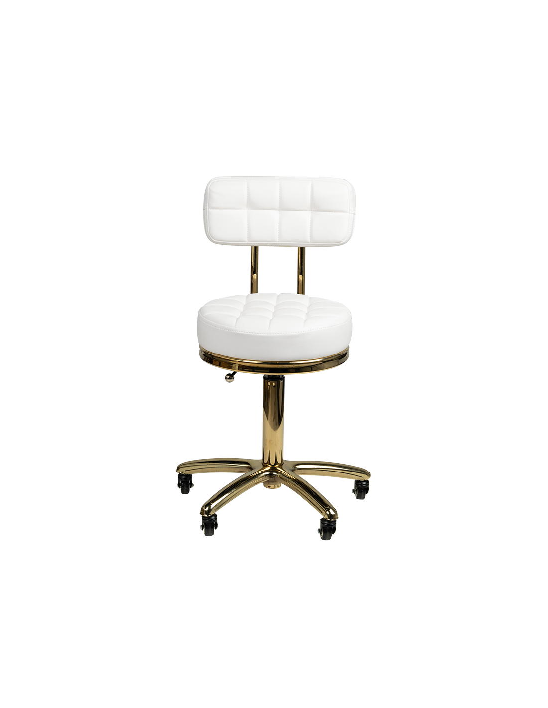 Wyjątkowy taboret kosmetyczny w kolorze białym z pikowanym siedziskiem i wygodnym oparciem. Elementy metalowe pięnie błyszczą złotym kolorem. Posiada regulację wysokości i pęcioramienną podstawę wyposażoną jest w solidne metalowo-gumowe kółka.