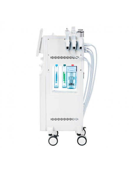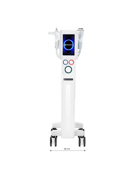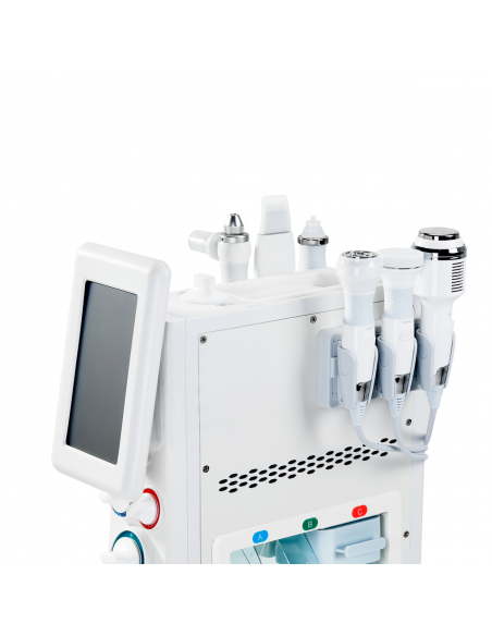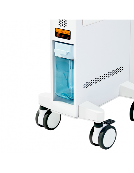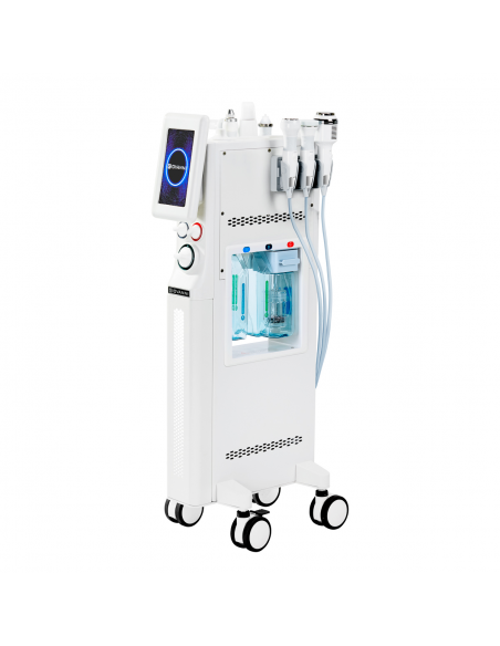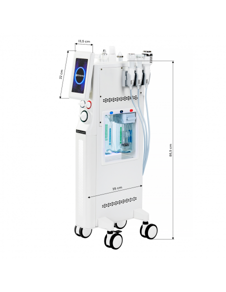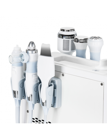 Praktyczne urządzenie wyróżnia się nowoczesnym i ergonomicznym designem, stanowiąc estetyczny element przestrzeni salonu kosmetycznego. Jego kompaktowe wymiary oraz mobilność zapewniana przez funkcjonalne kółka ułatwiają przechowywanie oraz transport. Wyposażone zostało w funkcjonalny system zbiorników na wodę oraz płyny niezbędne do zabiegów, co zapewnia wygodną i higieniczną pracę. Podstawka na głowice gwarantuje łatwy dostęp do niezbędnych akcesoriów, a półka na górze pozwala na odkładanie końcówek. Materiały zapewniają trwałość oraz łatwość czyszczenia, co przekłada się na wygodę użytkowania.