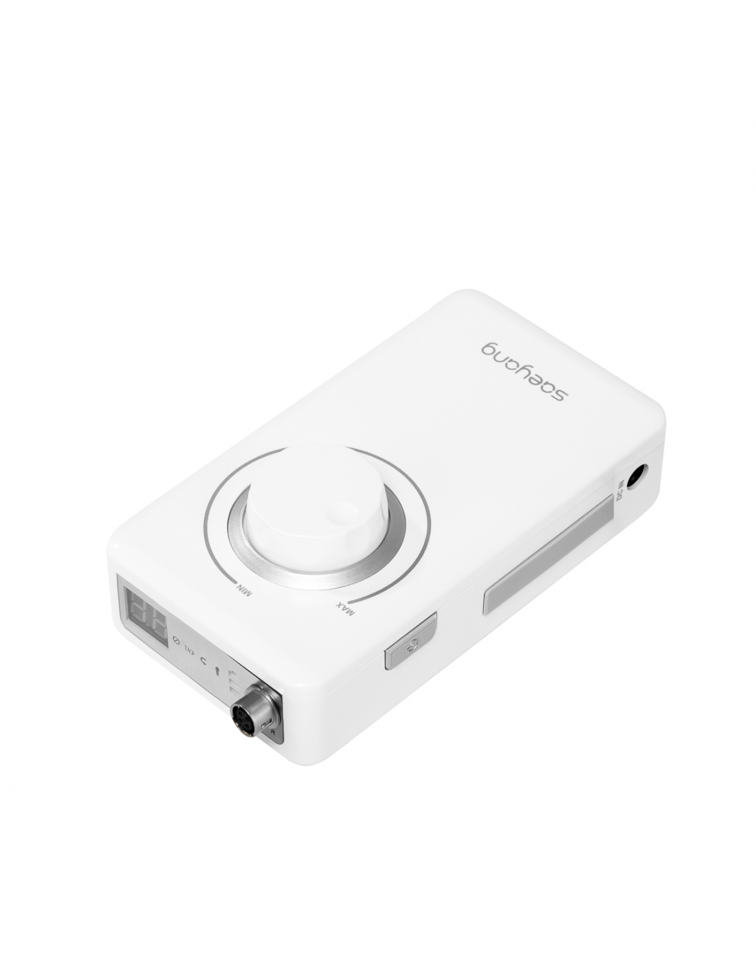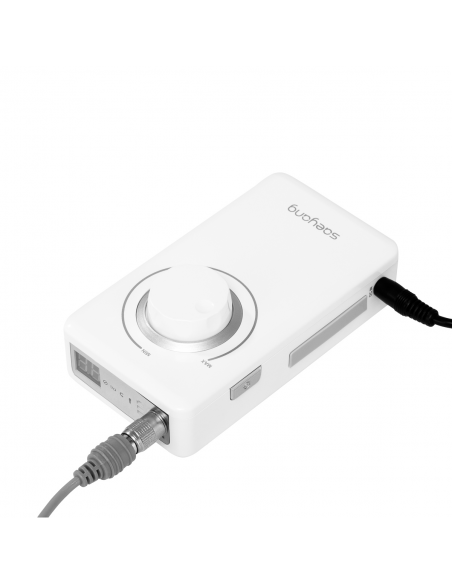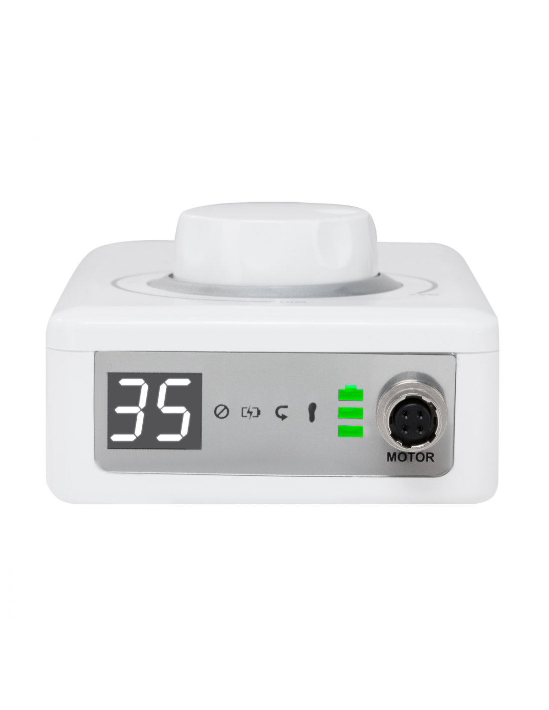 Przy użyciu pokrętła można regulować prędkość pracy głowicy do 35 000 obrotów na minutę, co pozwala na sprawne dostosowanie do indywidualnych potrzeb, a co za tym idzie komfortowe wykonywanie szerokiej gamy zabiegów. Przydatne przyciski umieszczone po bokach pozwalają łatwo przełączyć sterowanie na napęd nożny, zatrzymać pracę urządzenia (funkcja pauzy), a także zmienić kierunek obrotów, co zapewnia pełną kontrolę nad frezarką i ułatwia dostosowanie jej działania do konkretnych usług. Kontrolki LED pozwalają obserwować stan sprzętu – informują o kierunku obrotów, stanie baterii, włączeniu napędu nożnego i pauzy. Urządzenie wyposażone jest w zabezpieczenie przed przeciążeniem z ostrzegawczym sygnałem LED, co chroni silnik przed przegrzaniem, tym samym zapewniając większe bezpieczeństwo pracy oraz chroniąc sprzęt przed uszkodzeniem.