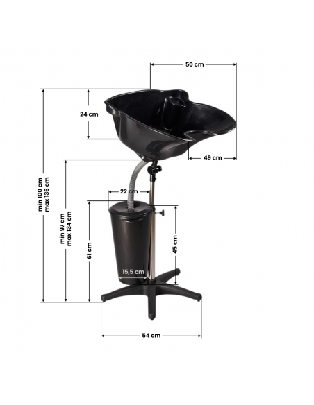 Myjka z głęboką misą wykonana jest z wysokiej jakości tworzywa sztucznego, które można łatwo wymyć z resztek farb i włosów. Dodatkowo misa myjki posiada wygodną regulację kąta nachylenia za pomocą śruby oraz otwór odpływowy z wężem do odprowadzania wodę bezpośrednio do zbiornika umieszczonego na regulowanym statywie.