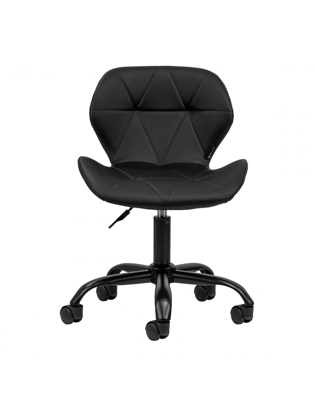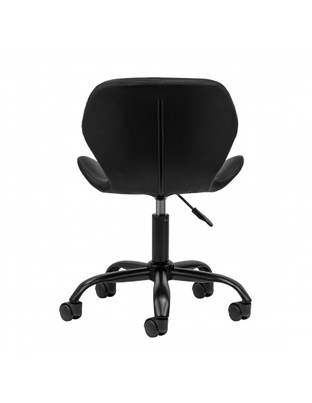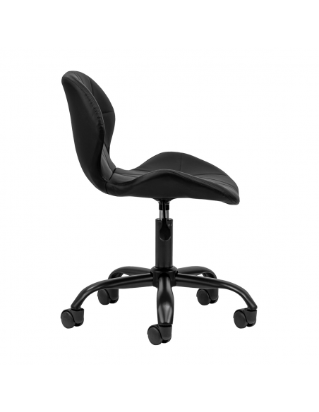 Pięcioramienna podstawa w odcieniach złota wyposażona jest w plastikowe kółka, które zapewniają znaczną mobilność, umożliwiając swobodne przemieszczanie mebla po gabinecie. Siedzisko taboretu zostało obite przyjemną w dotyku imitacją skóry w eleganckim odcieniu czerni. Zastosowany materiał gwarantuje trwałość, odporność na wilgoć oraz łatwość w utrzymaniu czystości. Całość dopełniają stylowe przeszycia, które podkreślają nowoczesny design.