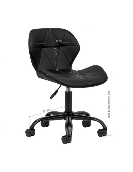Wydajny podnośnik gazowy pozwala na łatwą regulację wysokości siedziska w granicach 42-54 cm. Umożliwia to dopasowanie krzesła do indywidualnych potrzeb oraz przeprowadzanych usług, zapewniając wysoki komfort użytkowania – zarówno podczas wykonywania makijażu, stylizacji brwi, jak i w trakcie innych czynności. Wyprofilowane oparcie zapewnia odpowiednie wsparcie pleców. Krzesło wyposażone jest w mechanizm pełnego obrotu, co poprawia efektywność i wygodę pracy.