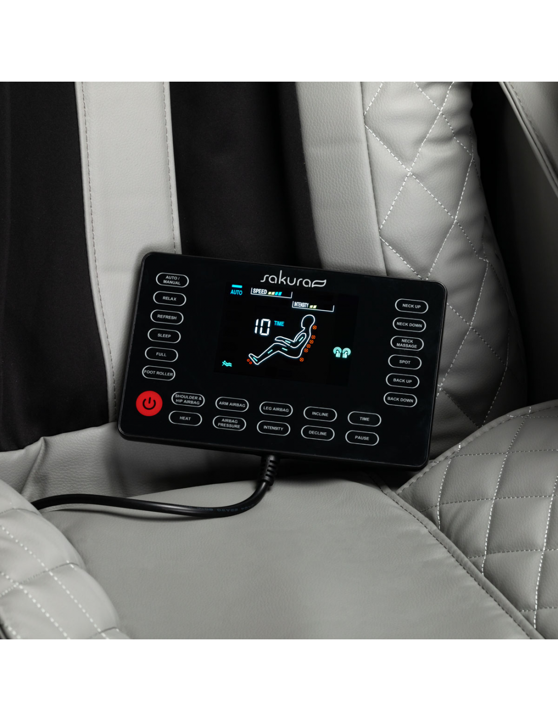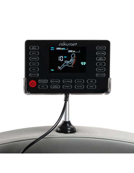 Czytelny panel sterowania sprawia, że korzystanie z fotela jest proste i przyjemne. Większą wygodę zapewnia możliwość umieszczenia go na uchwycie zamontowanym na prawym podłokietniku bądź trzymania w dłoniach. Na przejrzystym ekranie LCD można śledzić pracę urządzenia, wyraźnie wyświetlane są tam obszary ciała, na których w danym momencie przeprowadzany jest masaż, jego intensywność, czas zabiegu oraz wybrany program. Panel pozwala na wybór programu masażu, swobodne dostosowanie ustawień fotela oraz funkcji masażu, regulację intensywności, a także ustalenie czasu trwania zabiegu, który może wynosić 15, 20, 25 lub 30 minut.