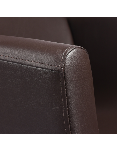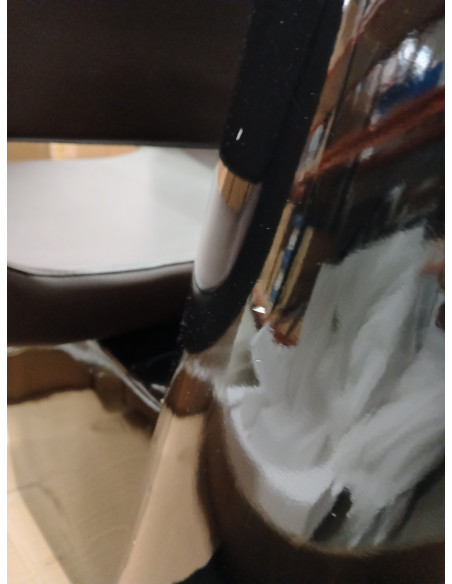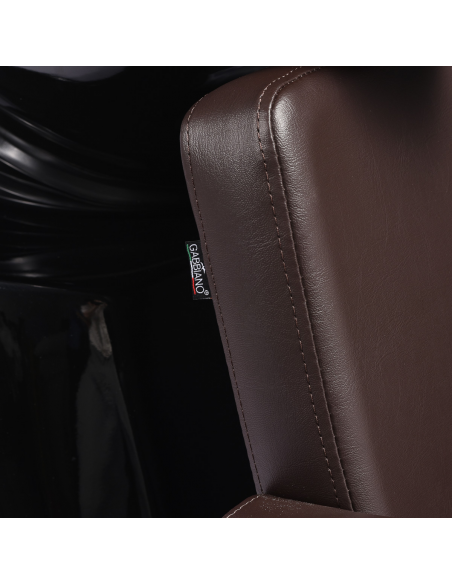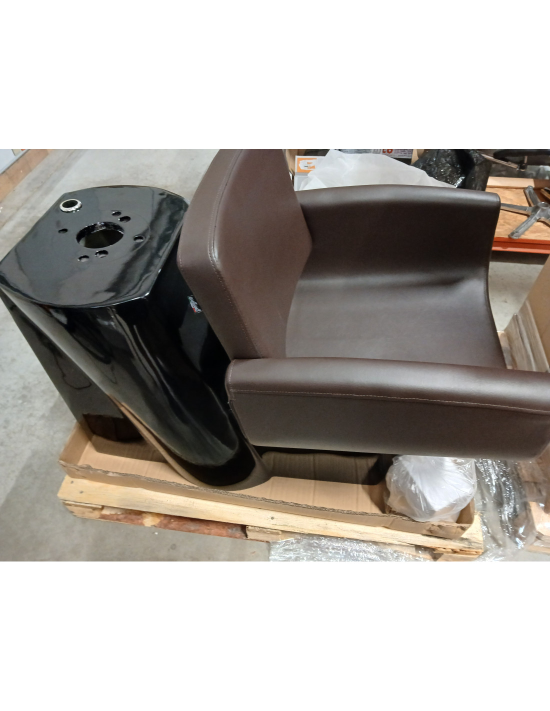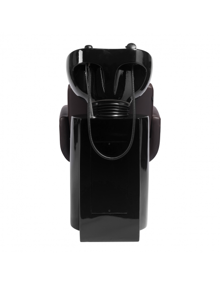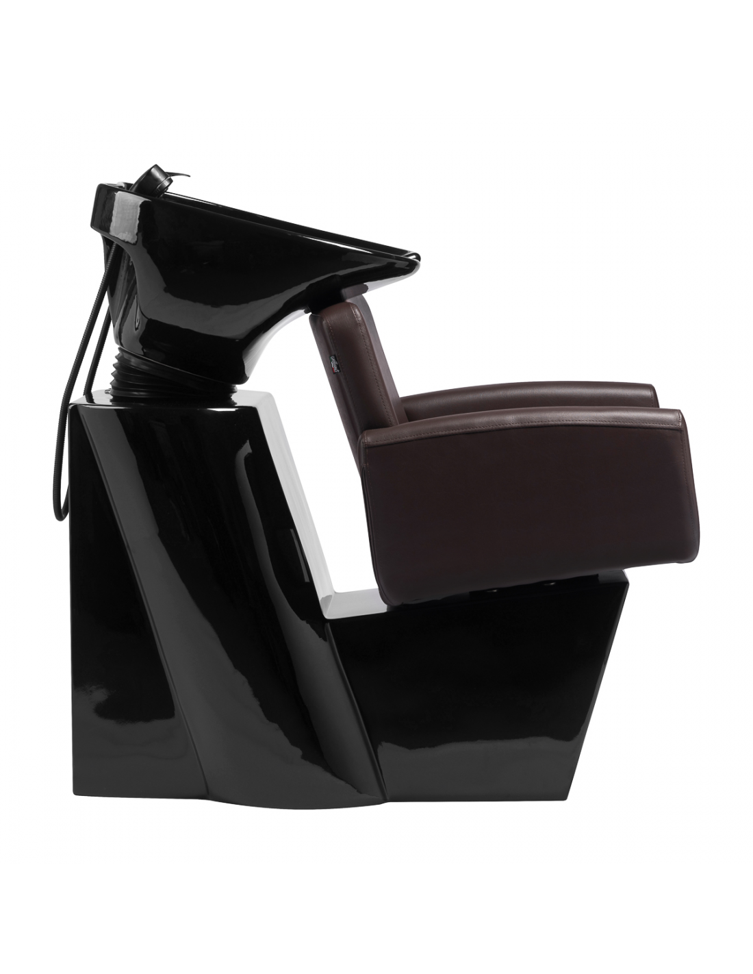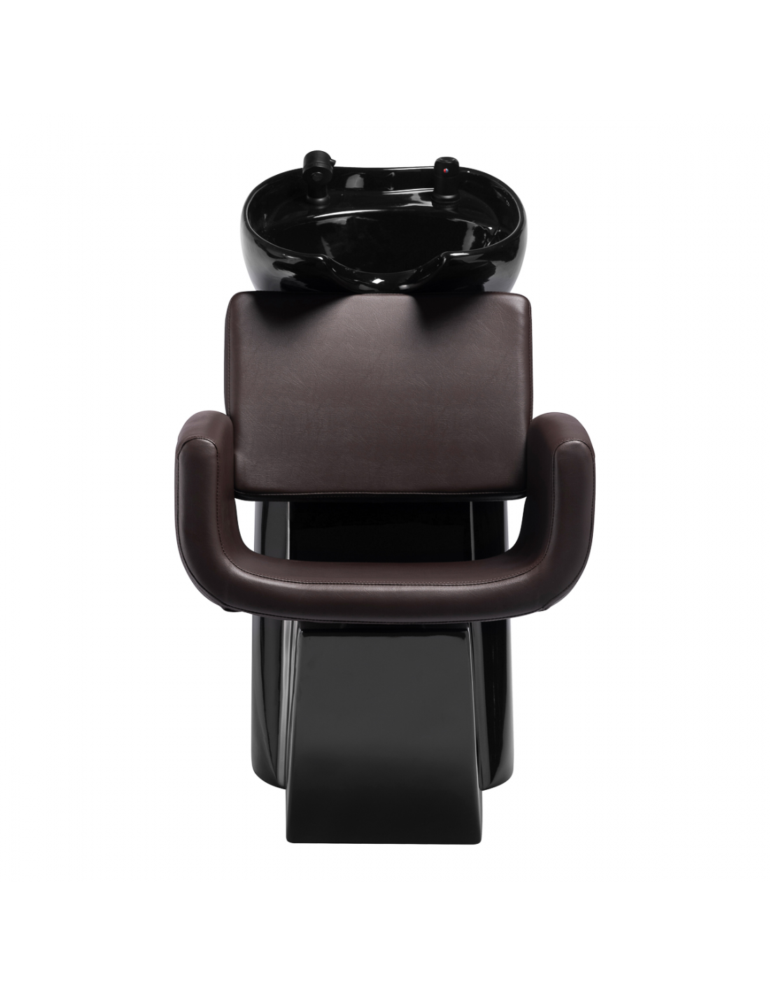 Minimalistyczny fotel o charakterystycznie zaokrąglonym siedzisku łączy prostotę formy z wysokim komfortem użytkowania. Oparcie o optymalnym kącie nachylenia wspiera naturalną pozycję ciała. Tapicerka wykonana z wysokiej jakości skóry syntetycznej w odcieniach brązu jest odporna na zużycie i łatwa do utrzymania w czystości. Nowoczesna linia mebla podkreśla elegancki charakter myjni oraz doskonale komponuje się z wystrojem salonu. W zestawie znajduje się kompletna armatura o matowym wykończeniu w odcieniach czerni, w tym bateria, słuchawka prysznicowa oraz dedykowane węże, aby zapewnić całkowity zestaw narzędzi do pracy.