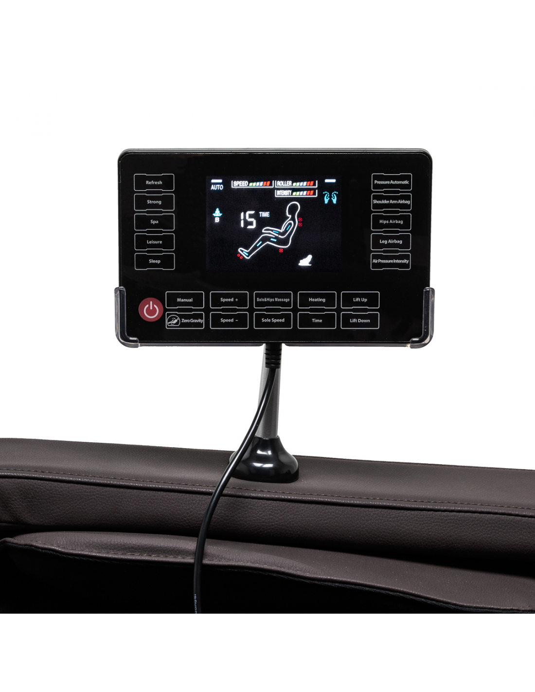 Przejrzysty panel sterowania z ekranem LCD zapewnia łatwą i intuicyjną obsługę fotela. Panel można wygodnie umieścić na uchwycie zamontowanym na prawym podłokietniku lub trzymać w dłoniach. Wyrazisty wyświetlacz pokazuje bieżącą pracę urządzenia, w tym masowane obszary ciała, intensywność masażu, czas zabiegu oraz wybrany program. Panel umożliwia precyzyjne dostosowanie ustawień fotela i funkcji masażu, a także wybór długości sesji, która może trwać 5, 10, 15, 20, 25 lub 30 minut.