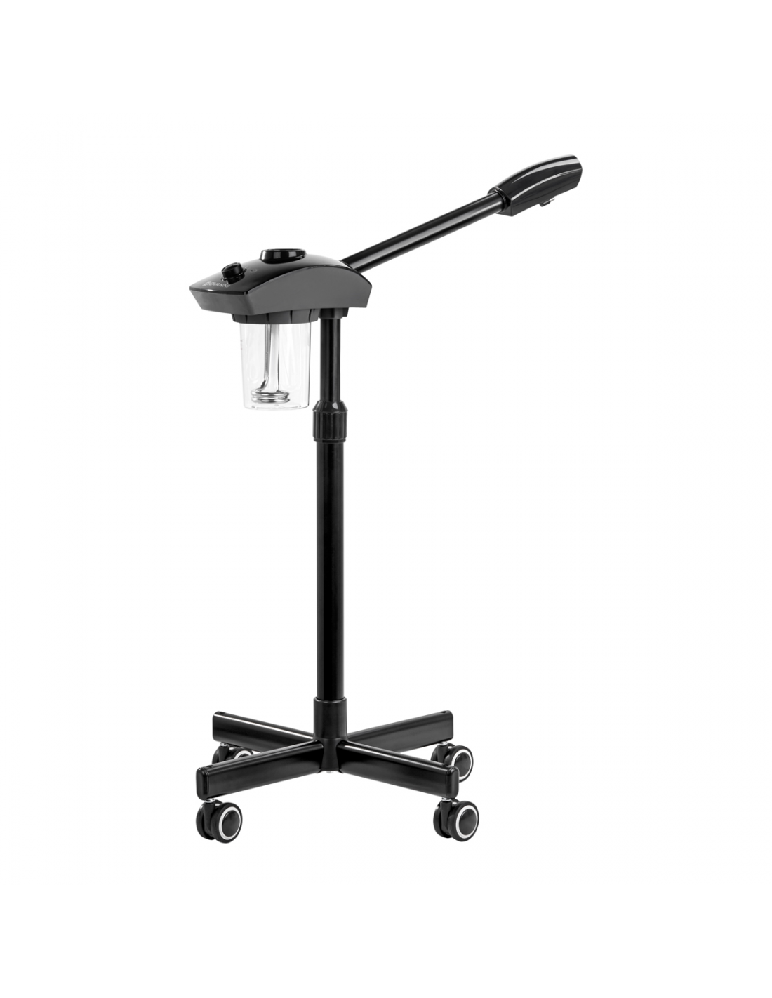 Wapozon wykonano z tworzywa sztucznego w odcieniach czerni, co sprawia, że urządzenie łatwo utrzymać w czystości. Statyw wyposażony jest w prostą regulację wysokości w zakresie 78-95 cm, co pozwala na ustawienie sprzętu na odpowiednim poziomie, by zapewnić komfort pracy osobie wykonującej zabieg. Dyszę wapozonu można obracać, co zwiększa zakres możliwego ustawienia. Czteroramienna podstawa o gumowanych kółkach poprawia mobilność, ułatwiając swobodne przestawianie urządzenia.