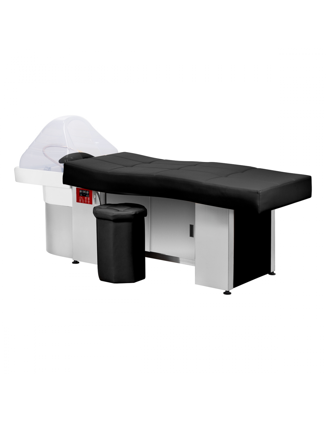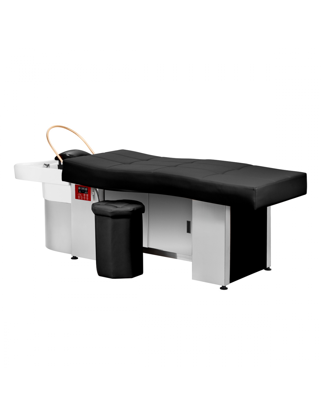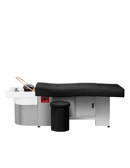Myjnia jest wyposażona w baterię z mieszaczem, co umożliwia łatwe dopasowanie temperatury do preferencji klienta. Dedykowane miejsce na słuchawkę natryskową ułatwia pracę, a chromowany korek ze specjalnym sitkiem pozwala na kontrolę przepływu wody oraz utrzymanie wysokich standardów higieny w salonie. Przyłącze wody umieszczono wewnątrz podstawy, co pozwala na sprawne ukrycie wszelkich rur. Leżankę wyprofilowano w taki sposób, by zapewniała wygodę podczas wykonywania różnorodnych zabiegów. Połączenie funkcjonalności i udogodnień sprawia, że praca w salonie fryzjerskim czy gabinecie SPA jest jeszcze bardziej komfortowa. W zestawie znajduje się również wygodna pufa, która zapewnia komfort pracy personelu, co czyni myjnię jeszcze bardziej wszechstronnym rozwiązaniem dla salonów SPA.