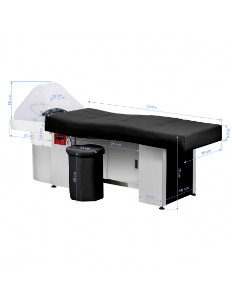 Leżanka Head Spa 017 to połączenie funkcjonalności i nowoczesnego designu. Wyposażona w solidną ramę ze stali nierdzewnej, gwarantuje stabilność i wytrzymałość. Ergonomicznie wyprofilowana leżanka pokryta jest miękką skórą syntetyczną w odcieniach czerni, zapewniając maksymalny komfort podczas zabiegów. Dodatkowo, zamykana na przesuwane drzwiczki przestrzeń pod leżanką pozwala na wygodne i estetyczne przechowywanie kosmetyków i akcesoriów, co sprawia, że jest to doskonały wybór do profesjonalnych salonów beauty & wellness.