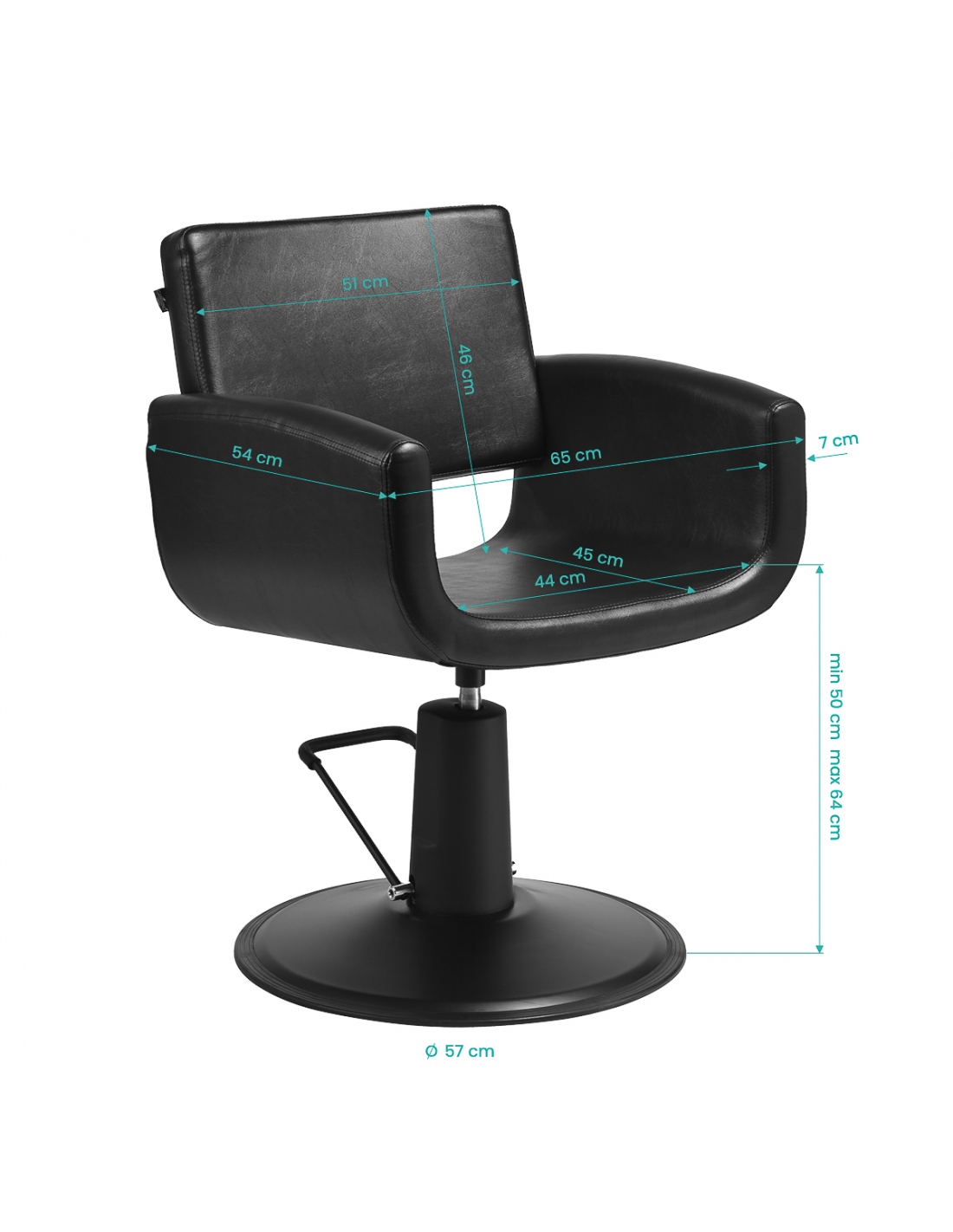 Trwały podnośnik hydrauliczny pozwala regulować wysokość siedziska w zakresie od 50 do 64 cm, również w trakcie użytkowania. Dzięki temu praca staje się bardziej ergonomiczna i mniej obciążająca, a pozycję można dopasować zarówno do wzrostu fryzjera, jak i klienta. Wygodne oparcie zapewnia stabilne podparcie pleców i ułatwia przyjęcie komfortowej pozycji, co jest szczególnie istotne podczas długich zabiegów, zwiększając komfort i satysfakcję klienta.