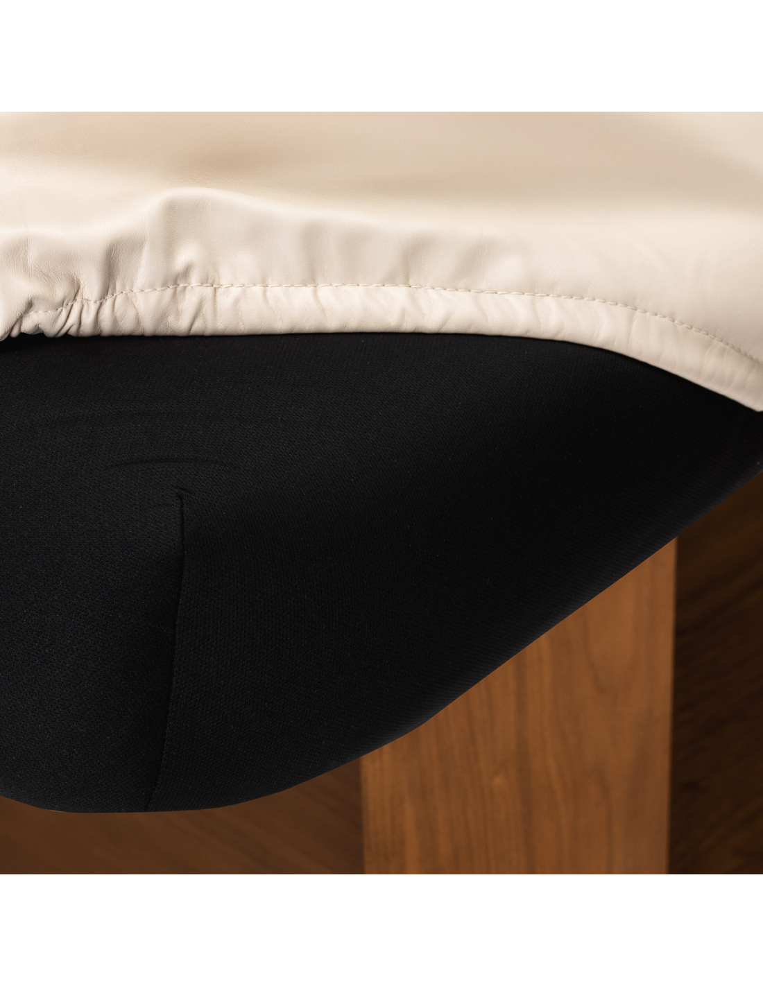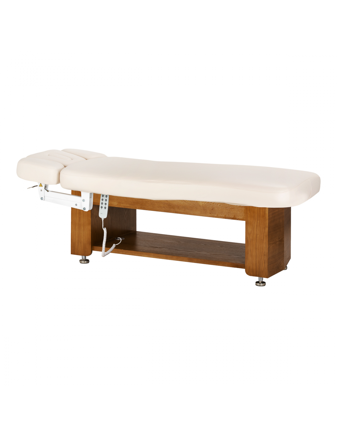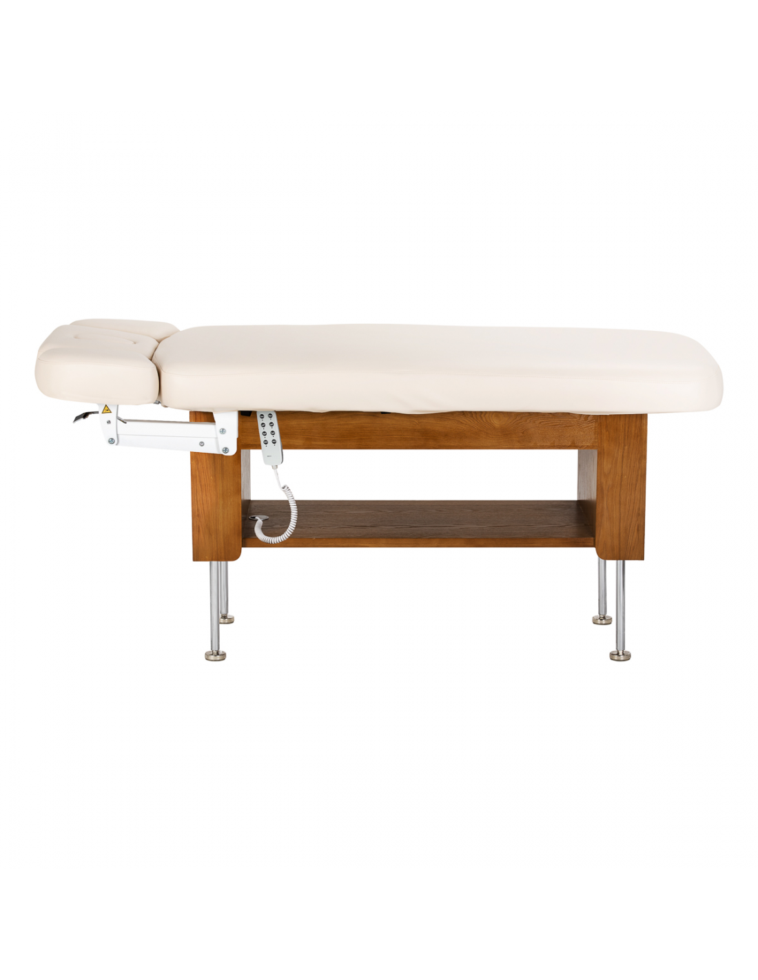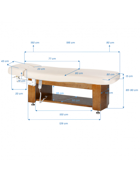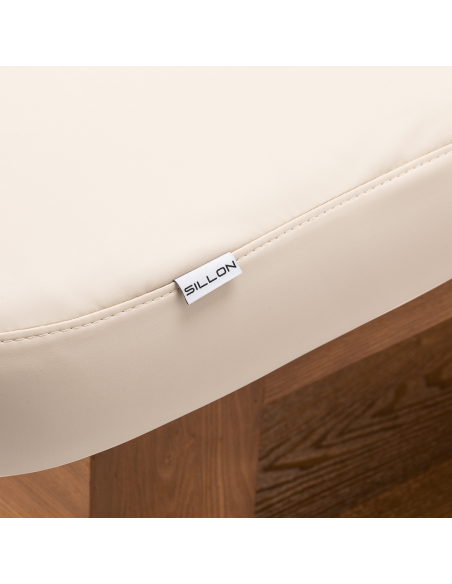 Solidna, drewniano-metalowa podstawa zapewnia wysoką stabilność i bezpieczeństwo podczas wykonywania zabiegów kosmetycznych, pielęgnacyjnych oraz masaży. Trwała konstrukcja gwarantuje pewne podparcie nawet przy intensywnej pracy, wspierając komfort zarówno klienta, jak i specjalisty. Ciepły odcień drewna w połączeniu ze stonowaną kolorystyką materaca sprawia, że leżanka wpisuje się w eleganckie wnętrza salonów masażu, gabinetów kosmetycznych i stref wellness. Starannie wykończone detale podkreślają profesjonalny charakter wyposażenia i budują spójny, estetyczny wizerunek gabinetu.