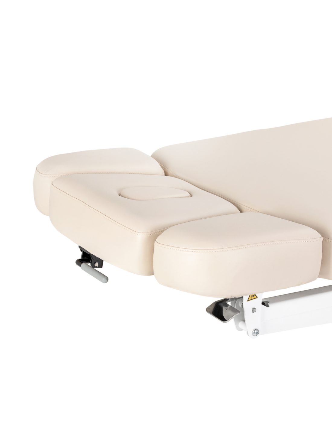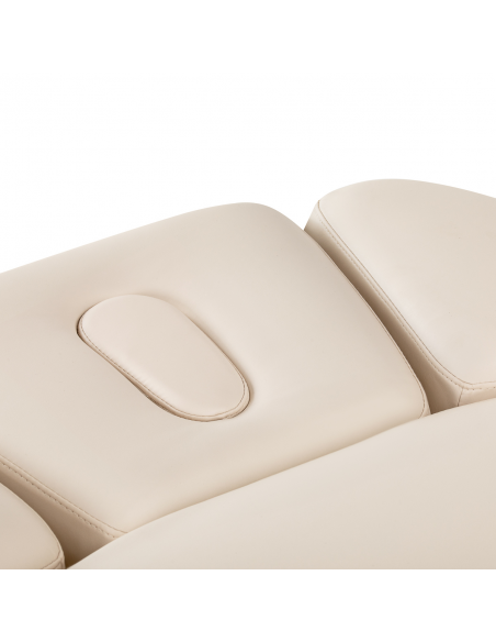 Zagłówek został zaprojektowany z myślą o maksymalnym komforcie klienta i funkcjonalności pracy specjalisty. Główna część jest regulowana manualnie, umożliwiając ustawienie optymalnej pozycji podparcia głowy, natomiast boczne segmenty poruszają się w górę i w dół, dopasowując się do indywidualnej anatomii klienta. Takie rozwiązanie zapewnia wygodne ułożenie podczas zabiegów, podtrzymanie prawidłowej pozycji oraz zwiększa komfort zarówno klienta, jak i osoby wykonującej zabieg.