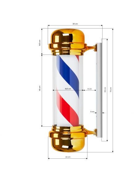 Przykuwający wzrok plafon podświetlany, wyposażony w obrotowy cylinder, stanowi doskonałą reklamę dla barbershopu. Charakterystyczny design, z obracającymi się elementem w kolorach czerwonym, białym i niebieskim, tworzy wyjątkową, międzynarodowo rozumianą wizytówkę salonu fryzjerskiego. Za pomocą pilota na przewodzie można włączać zarówno oświetlenie, jak i obroty plafonu.