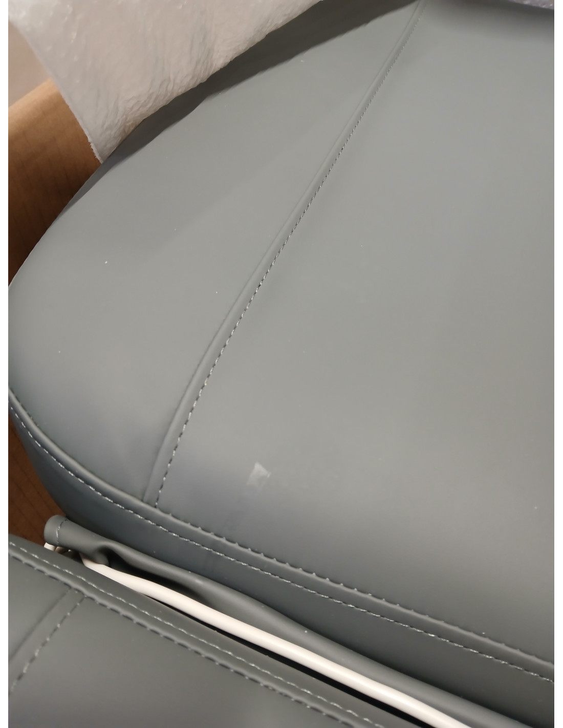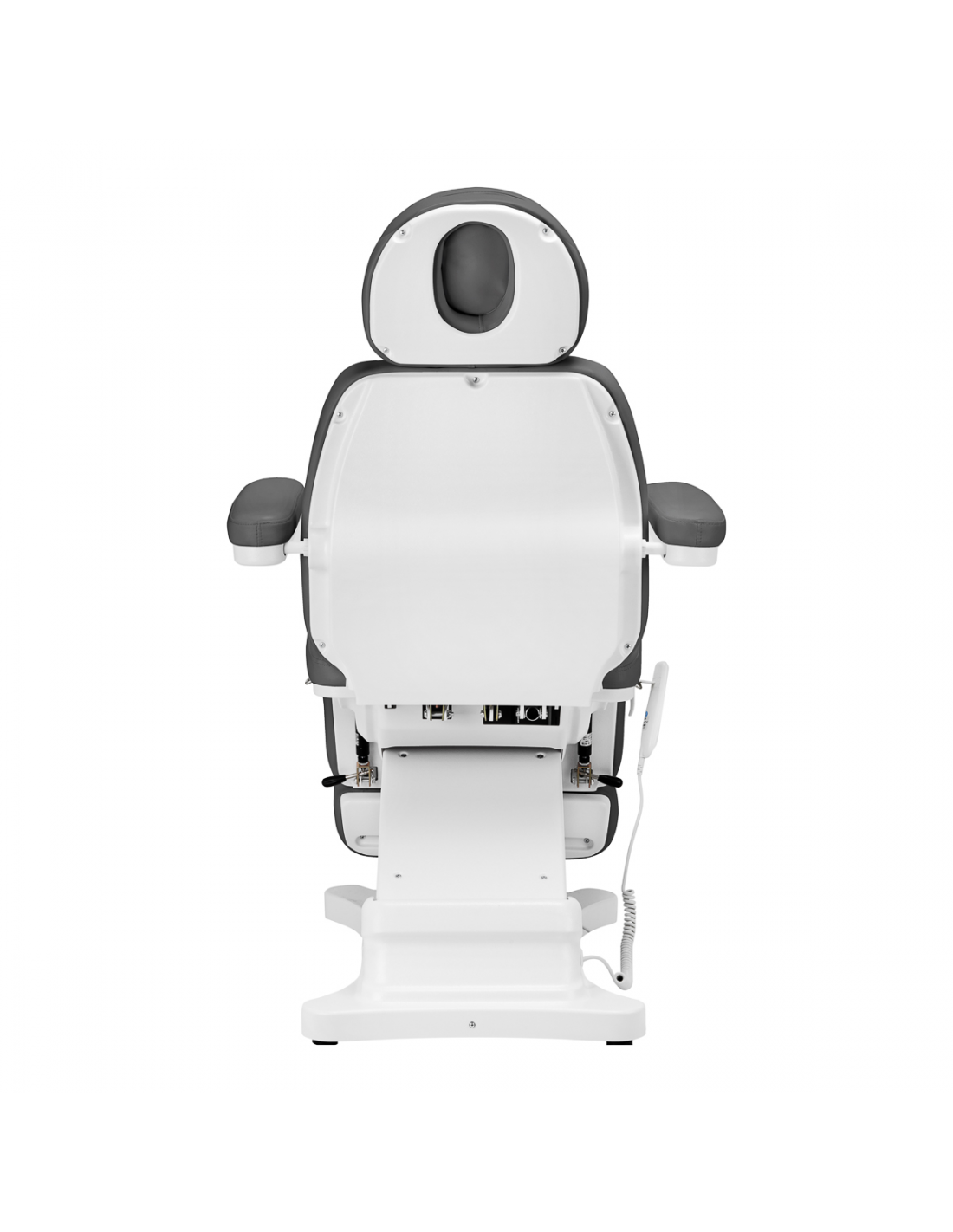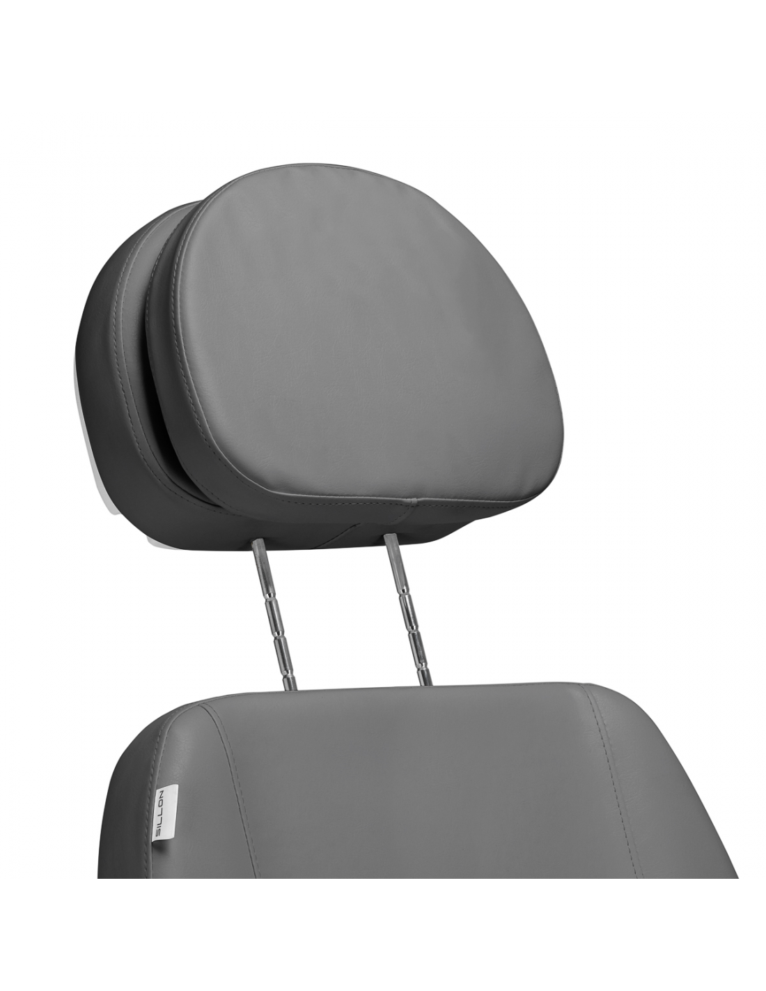 Fotel wypełniony jest wyprofilowaną pianką i pokryty przyjemną w dotyku skórą syntetyczną w odcieniach szarości. Użyty materiał sprawia, że sprzęt jest łatwy w czyszczeniu, a także odporny na wilgoć i wybrane środki dezynfekcji. Solidna podstawa wykonana z trwałego materiału w odcieniach bieli zapewnia stabilność w trakcie zabiegów. Odpowiednio wyprofilowane obszycia nadają fotelowi stylowy wygląd i sprawiają, że siedzisko jest ergonomiczne. Minimalistyczny, prosty design i klasyczna kolorystyka pozwalają mu wpasować się w każde wnętrze.