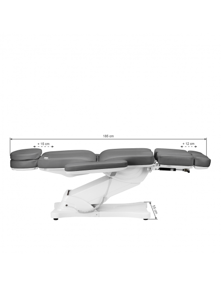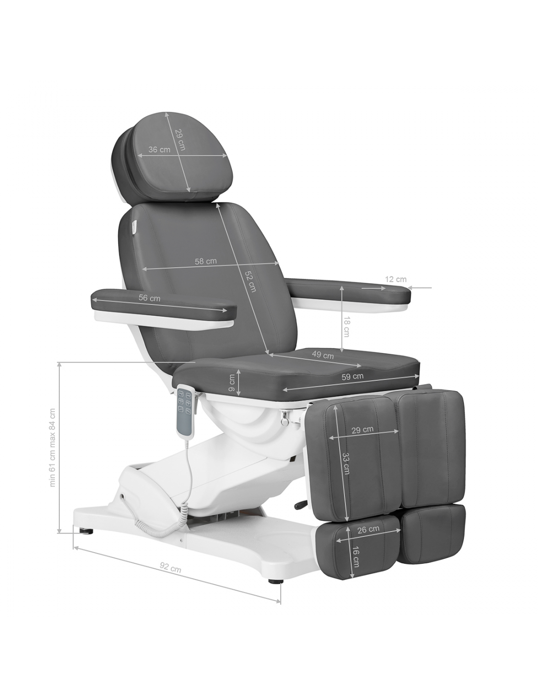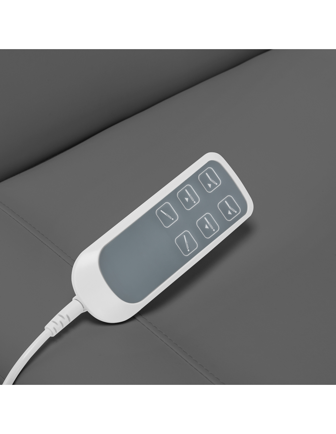 Przy użyciu prostego w obsłudze pilota fotel płynnie dostosowuje się w 3 płaszczyznach – posiada regulację wysokości, oparcia oraz nachylenia kołyski. Siedzisko można ustawić tak, by znajdowało się na wysokości od 61 cm do 84 cm, a przy całkowitym rozłożeniu fotel osiąga długość 2 m. Wymiary te pozwalają na łatwe korzystanie ze sprzętu osobom o różnym wzroście i umożliwiają dostosowanie go do aktualnie wykonywanego zabiegu oraz indywidualnych potrzeb, co wpływa zarówno na komfort użytkownika, jak i osoby wykonującej usługi. Uchwyty znajdujące się po obu stronach siedziska pozwalają na odwieszenie pilota tak, by znajdował się zawsze pod ręką.