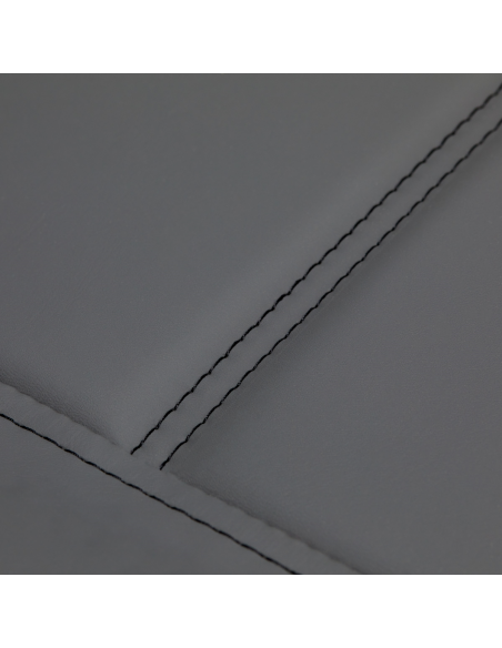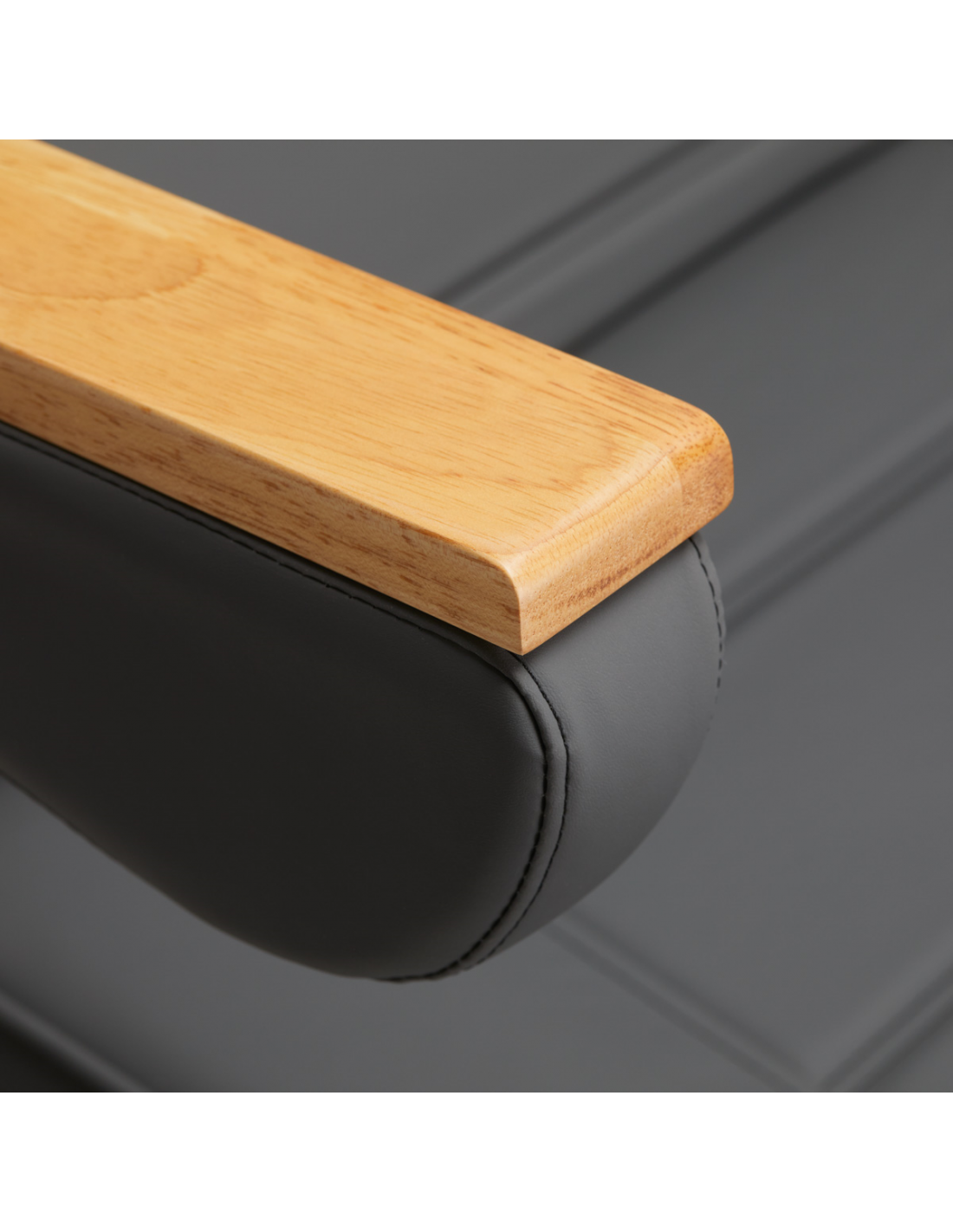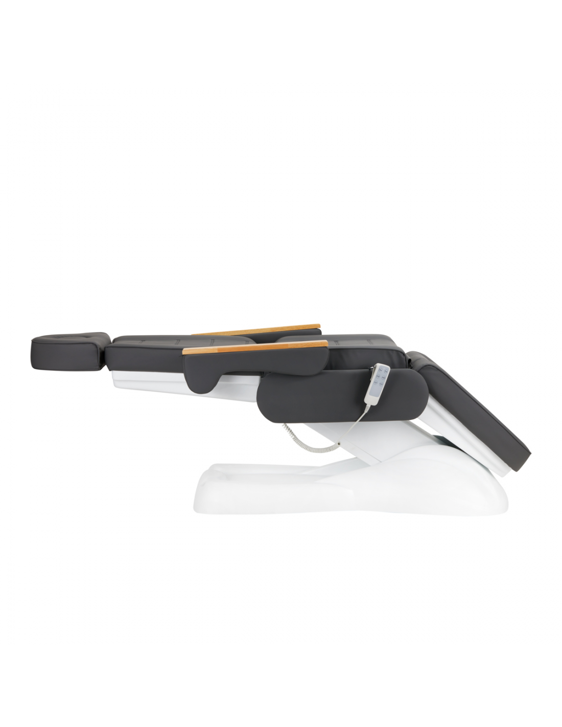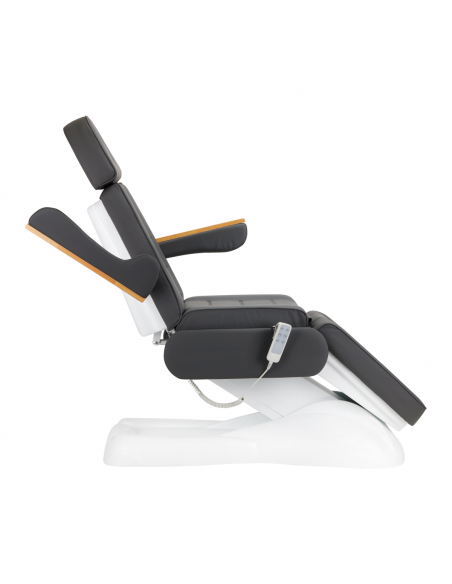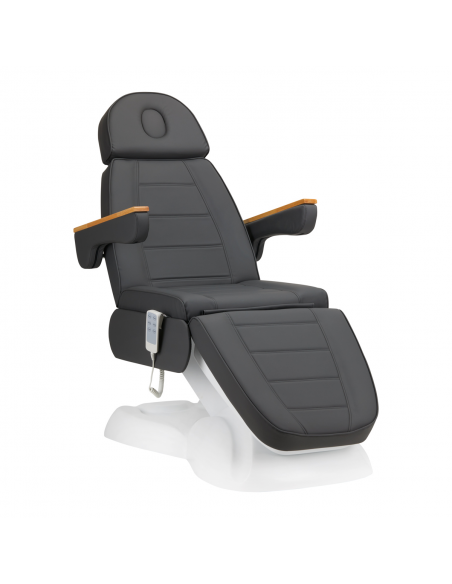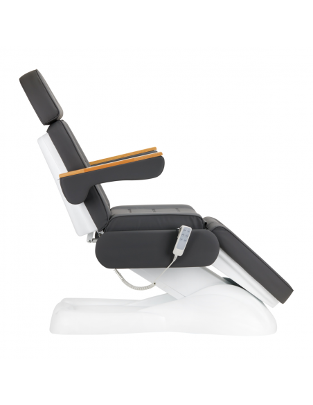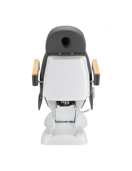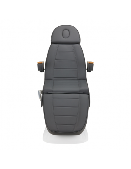 Fotel wypełniony jest pianką o odpowiedniej twardości oraz pokryty przyjemną w dotyku imitacją skóry w odcieniach szarości. Dzięki użyciu materiału, który jest łatwy do utrzymania w czystości oraz odporny na wybrane środki dezynfekcji, sprzęt jest komfortowy w użytkowaniu, wytrzymały na wilgoć oraz nieskomplikowany w czyszczeniu. Solidna podstawa wykonana z trwałego materiału w odcieniach bieli zapewnia stabilność w trakcie zabiegów. Ozdobne drewniane elementy na podłokietnikach wyróżniają fotel pośród innych modeli, stanowiąc atrakcyjny wizualnie, elegancki akcent. Odpowiednio wyprofilowane obszycia nadają fotelowi stylowy wygląd i sprawiają, że siedzisko jest ergonomiczne.
