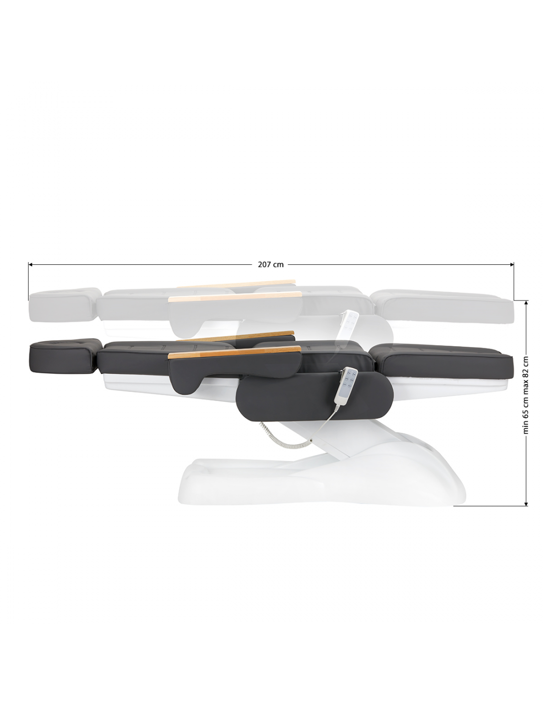 Wysokość siedziska regulowana jest w zakresie od 65 cm do 84 cm, a przy całkowitym rozłożeniu fotel osiąga długość ponad 2 metrów. Wymiary te pozwalają na łatwe korzystanie ze sprzętu osobom o różnym wzroście i umożliwiają dostosowanie go do potrzeb zarówno klienta, jak i osoby wykonującej zabieg. Po prawej stronie siedziska zamontowano specjalny metalowy uchwyt do wieszania pilota, co znacznie ułatwia jego przechowywanie i sprawia, że zawsze znajduje się pod ręką.