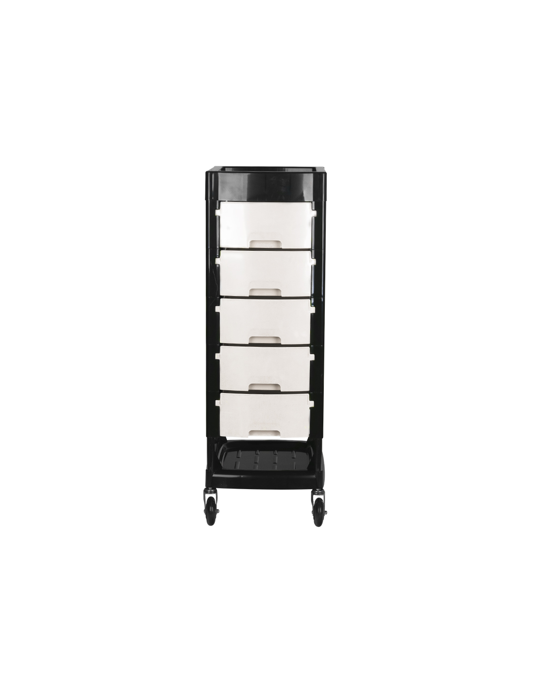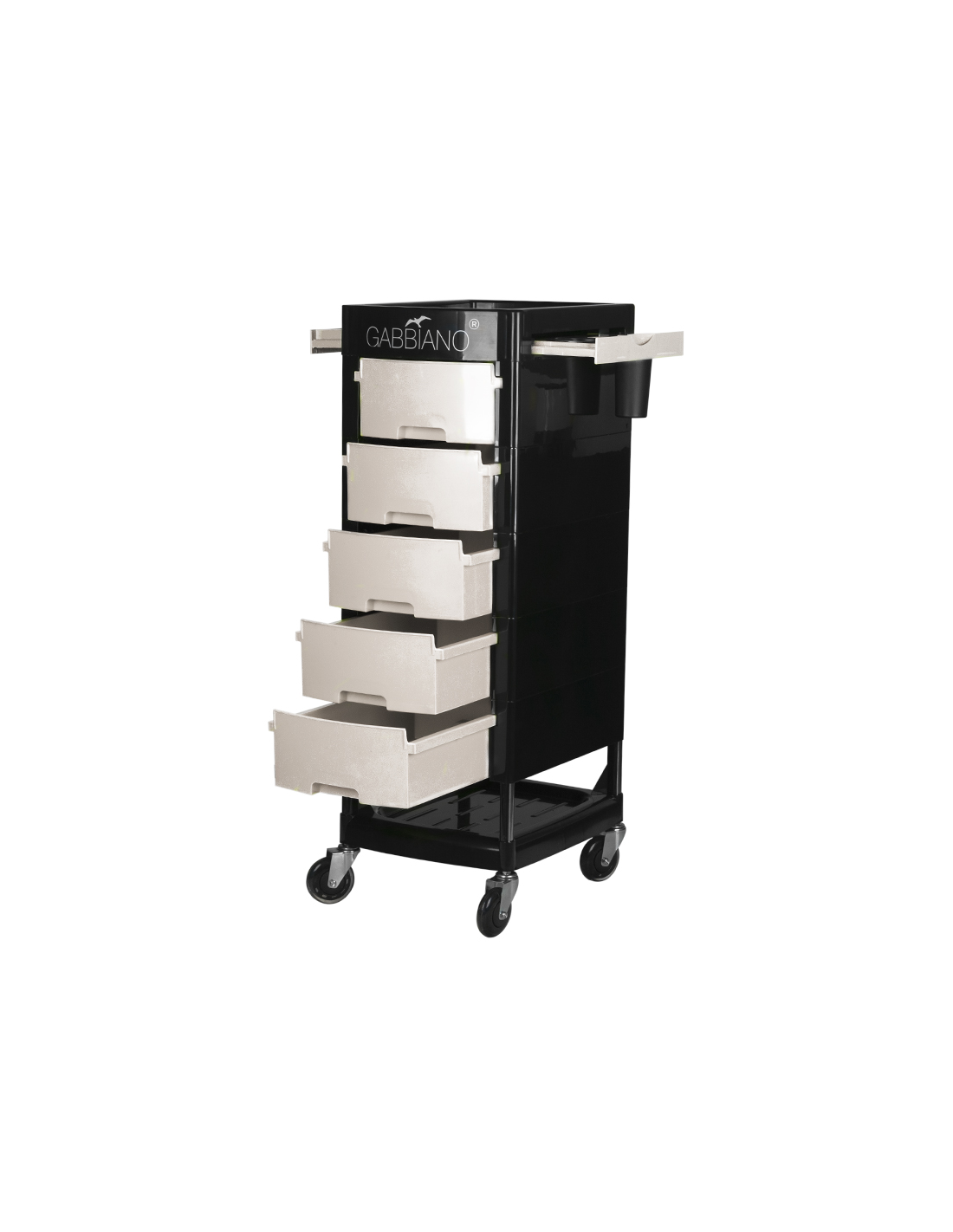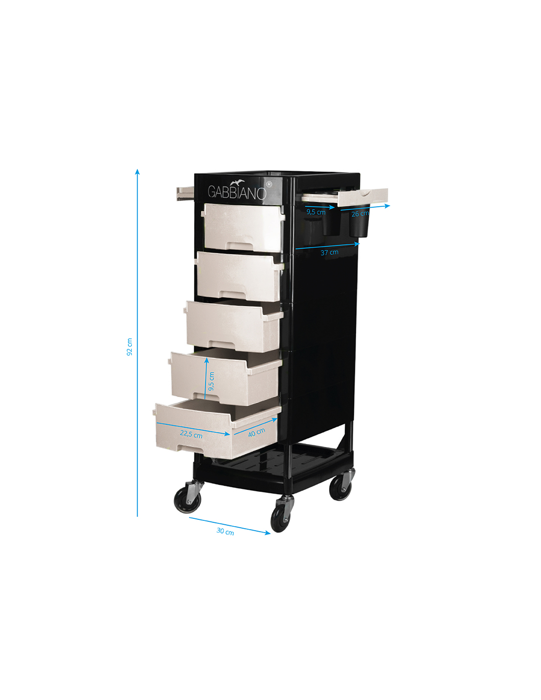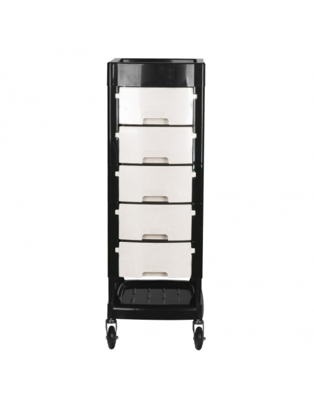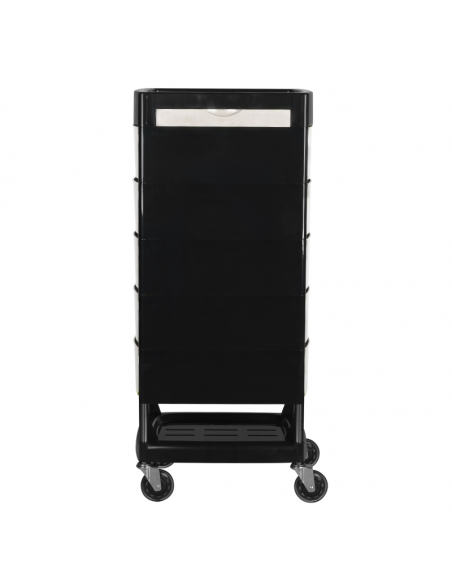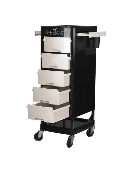 Pomocnik fryzjerski Gabbiano to wysokiej jakości mebel. Wykonany został w wytrzymałego tworzywa ABS ze stalową konstrukcją ramy, zapewniającą wysoką stabilność i wytrzymałość. Całość jest osadzona na bardzo wytrzymałych łożyskowanych, gumowych kółkach. Dominujący kolor czerni przełamany kolorem szuflad idealnie dopasuje się do wystroju Twojego salonu!