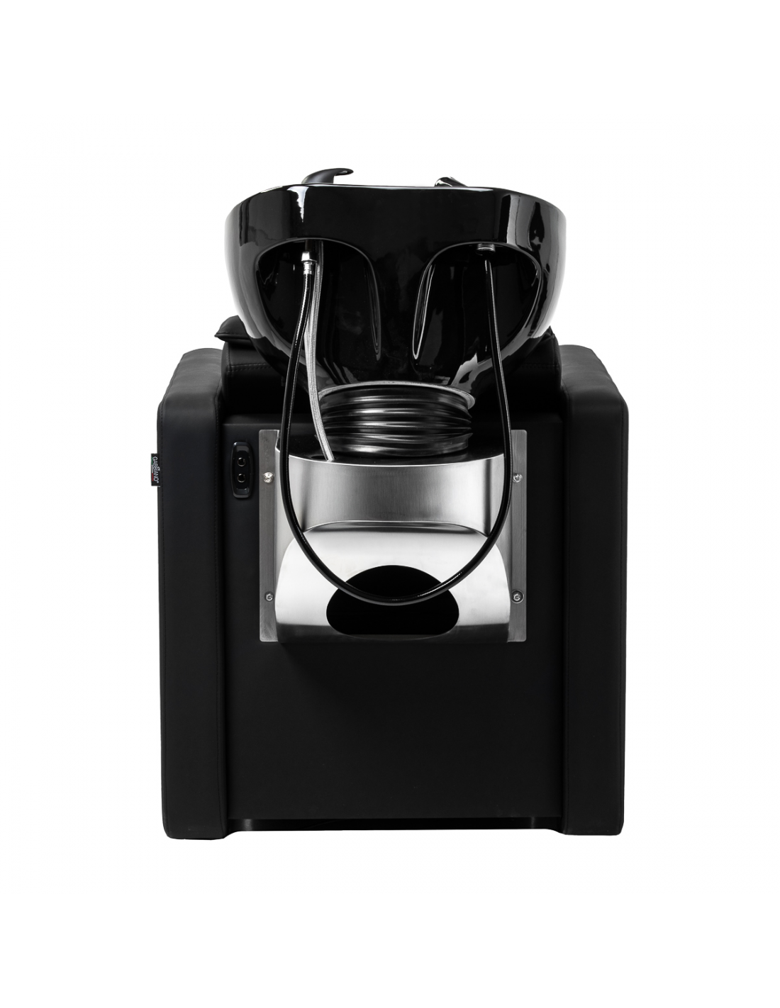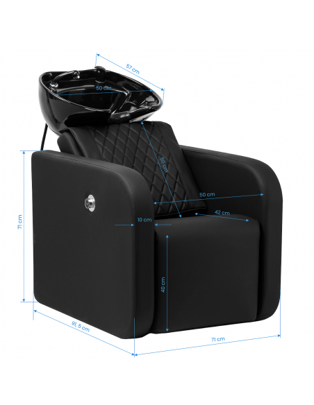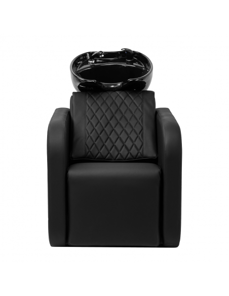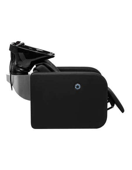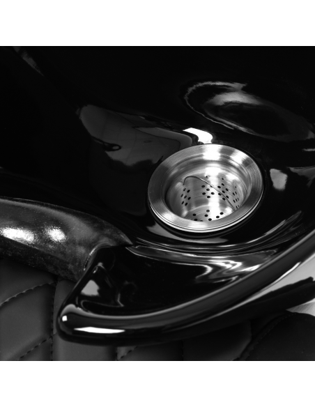 Głębokość ceramicznej misy umywalki w odcieniach czerni pozwala na komfortowe i efektywne wykonywanie szerokiej gamy usług fryzjerskich, zapobiegając nadmiernemu rozchlapywaniu wody oraz używanych w trakcie zabiegu produktów. Zastosowany materiał sprawia, że umywalka jest wytrzymała, odporna na przebarwienia i zadrapania oraz bardzo łatwa do utrzymania w czystości. Odpowiednio wyprofilowany kołnierz oraz nachylone oparcie zapewniają wsparcie i wygodę w trakcie mycia włosów, a dzięki komfortowej nakładce z tworzywa sztucznego w odcieniach czerni klient nie odczuje nieprzyjemności związanych z chłodem ceramicznej powierzchni.