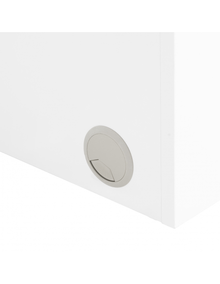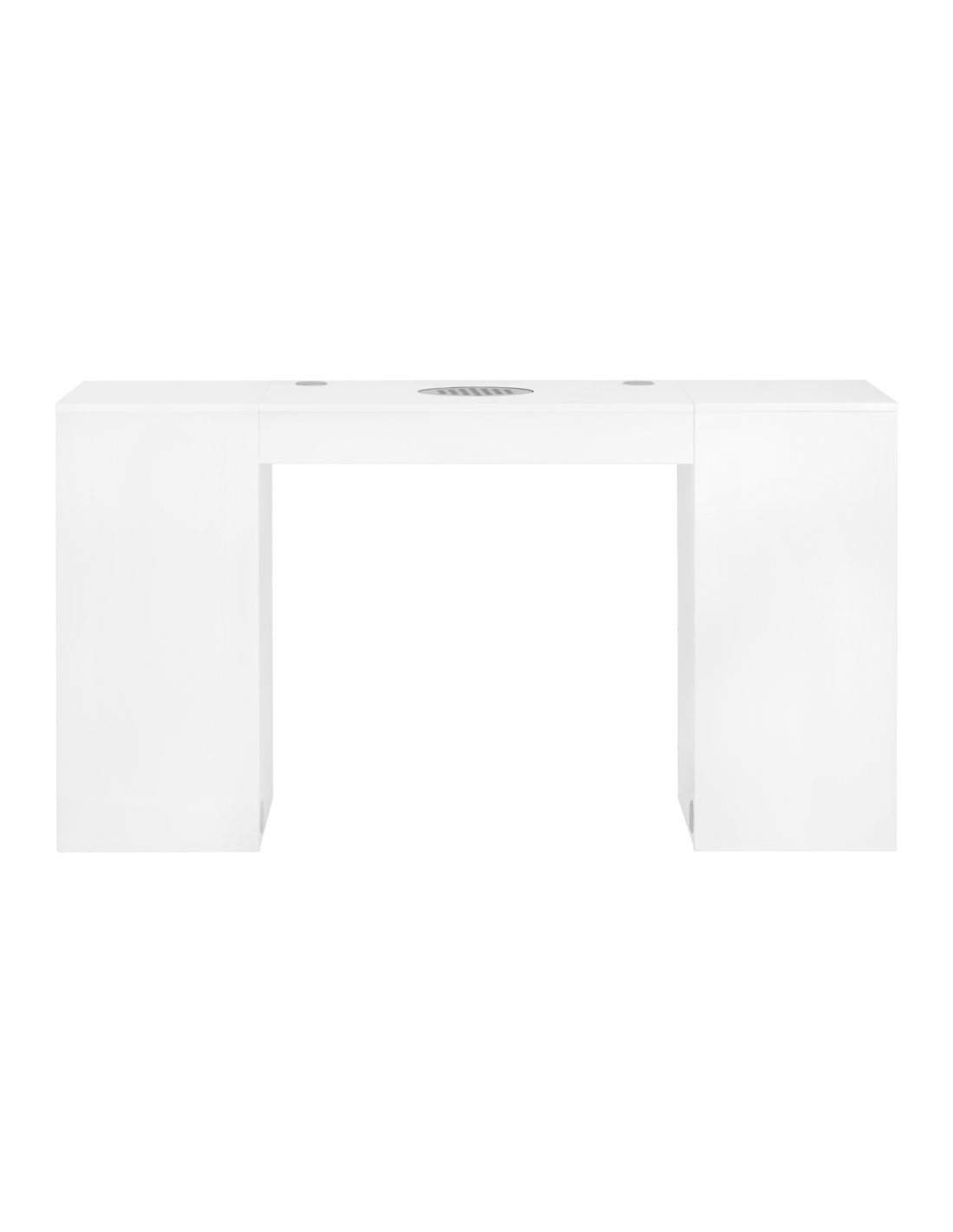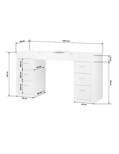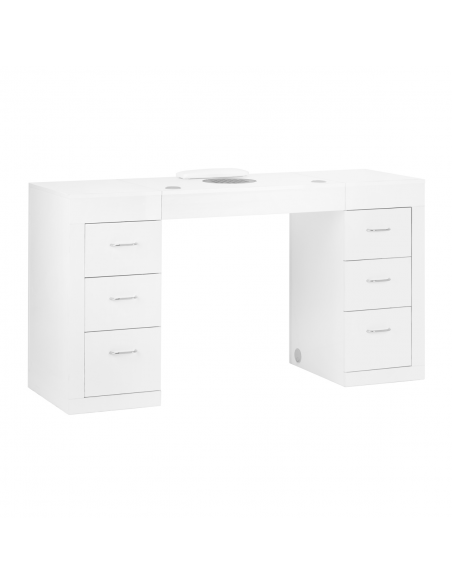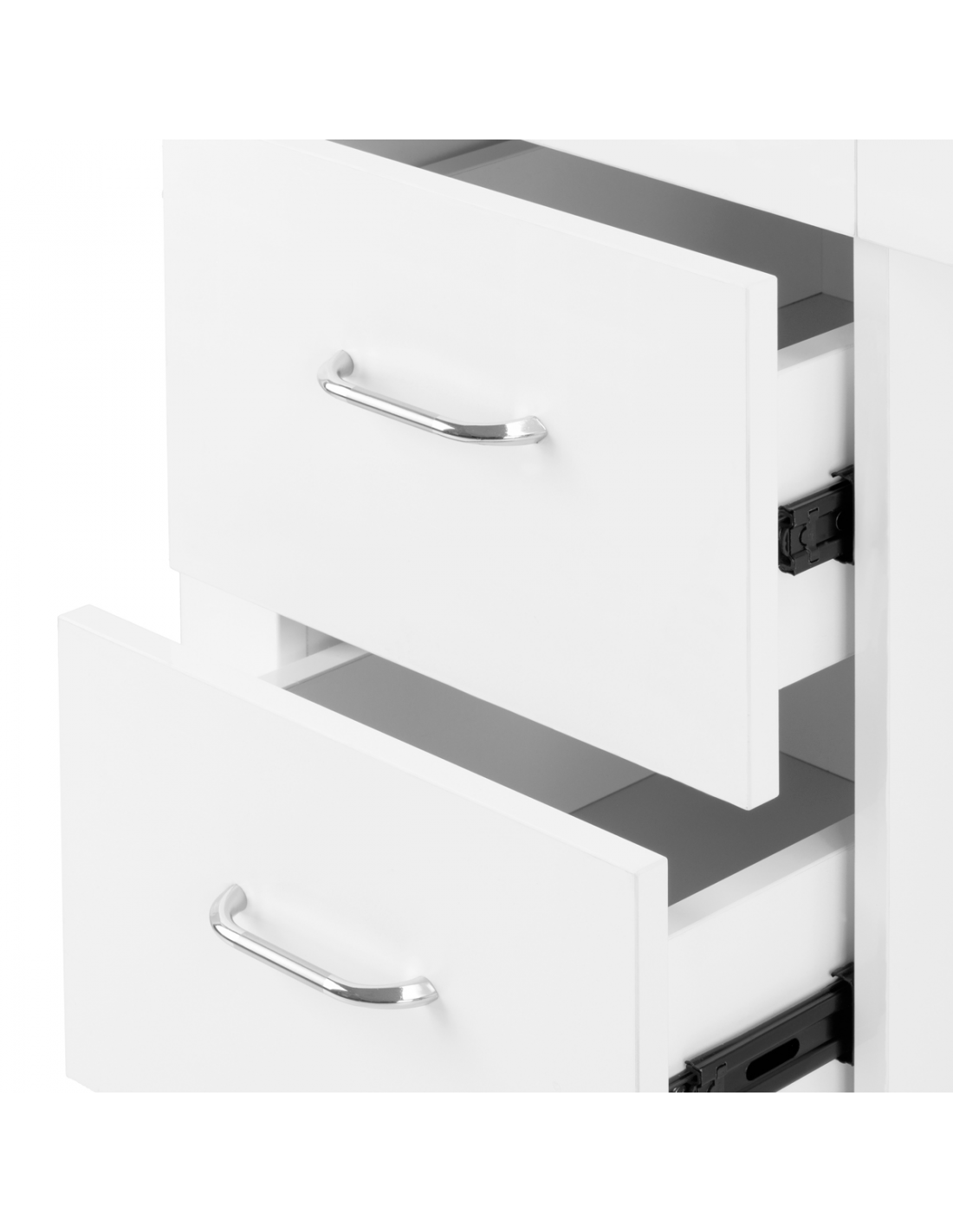 Szafki po obu stronach z trzema pojemnymi szufladami znacznie ułatwiają organizację oraz utrzymanie porządku w najpotrzebniejszych kosmetykach i narzędziach. Dzięki temu niezbędne produkty zawsze znajdują się pod ręką, co przekłada się na efektywność pracy. Biurko ma specjalne otwory w blacie do przeprowadzania kabli od niezbędnych urządzeń, co pozwala na łatwe utrzymanie porządku i estetyki stanowiska pracy.