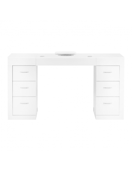 Funkcjonalne biurko kosmetyczne 324 z pochłaniaczem pyłu doskonale sprawdza się w salonach kosmetycznych, zapewniając wygodną przestrzeń do pracy. Solidna konstrukcja mebla gwarantuje stabilność, a pojemne szuflady zostały odpowiednio zaprojektowane, aby ułatwić dostęp do niezbędnych narzędzi, co przekłada się na efektywność pracy. Prosty design nadaje mu profesjonalnego charakteru.