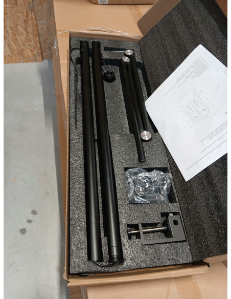 Zestaw zawiera: głowicę lampy, przewód zasilający, stelaż, uchwyt imadłowy, pilot bezprzewodowy, instrukcję.
