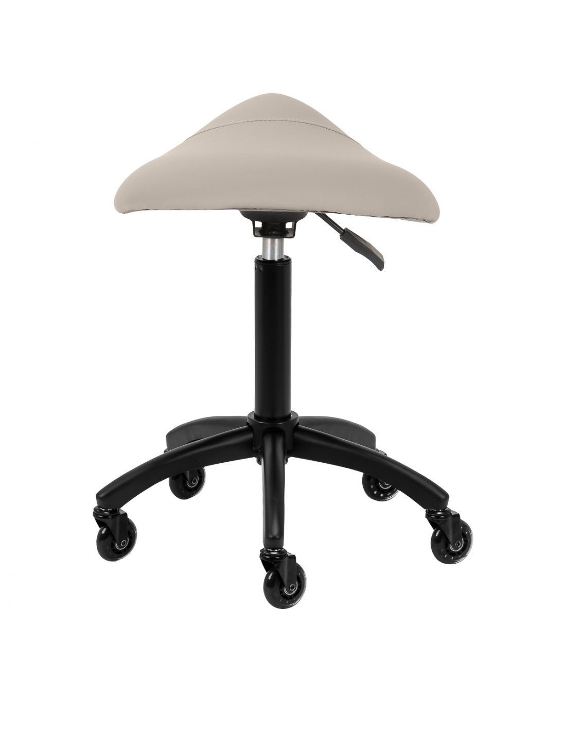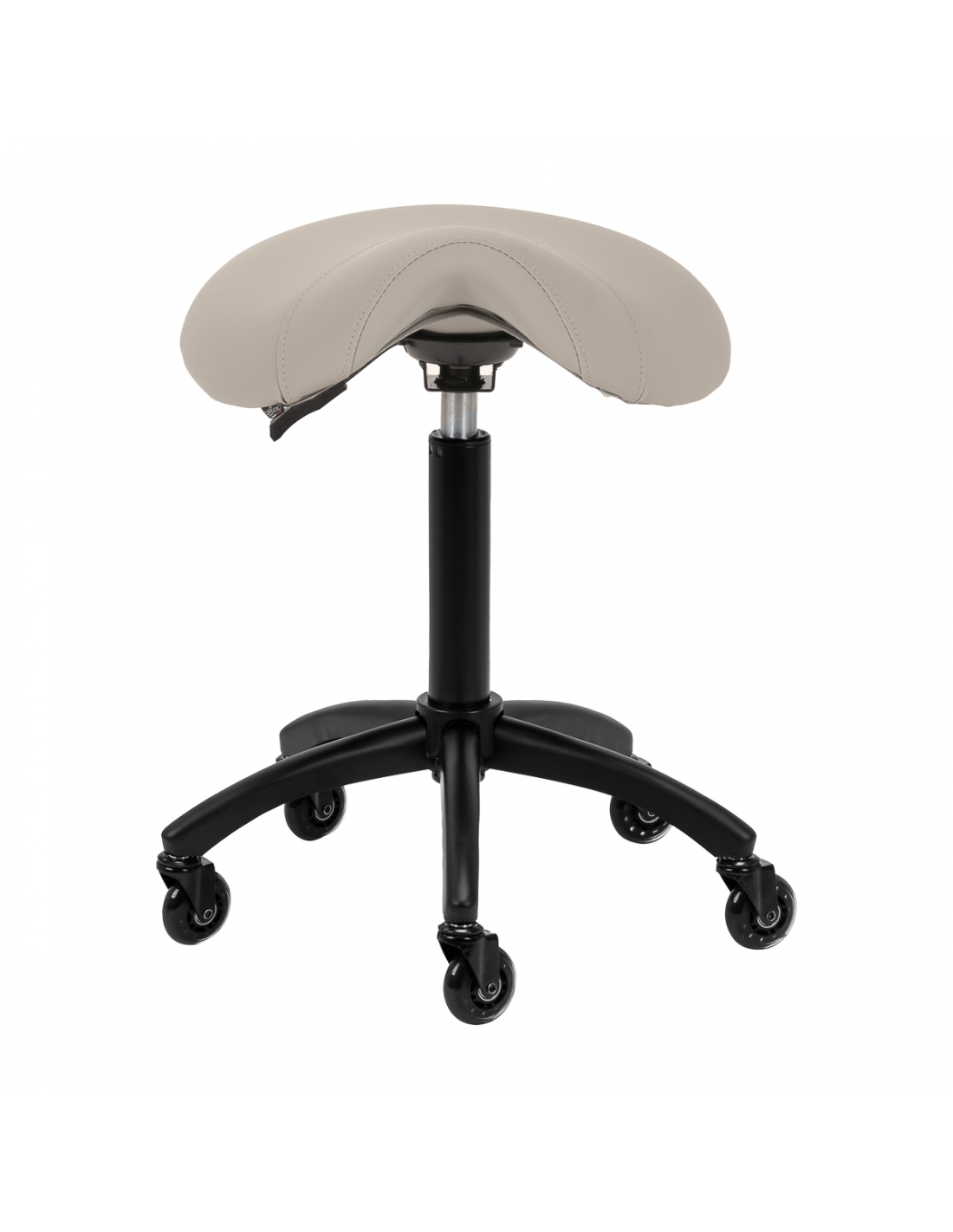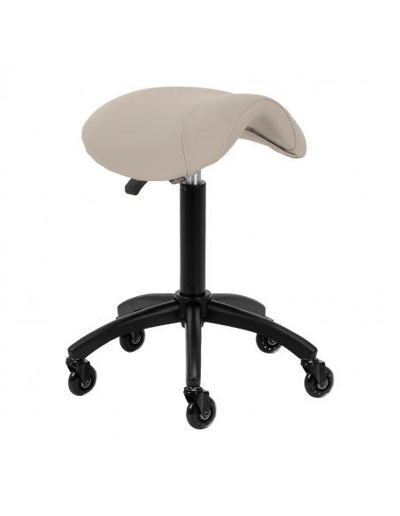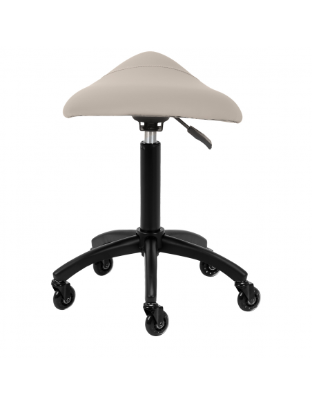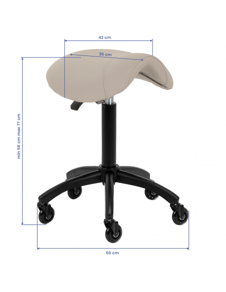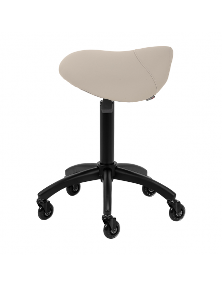 Regulacja wysokości siedziska w zakresie 56-77 cm pozwala specjaliście dostosować pozycję w trakcie wykonywania usług. Odpowiednio wyprofilowane na kształt siodła siedzisko wypełnione niepodatną na odkształcenia pianką gwarantuje użytkownikom wygodę i ergonomię pracy. Mechanizm pełnego obrotu sprawia, że praca staje się bardziej efektywna i wygodna. Mobilność zapewniają kółka Roll Speed z żelaznym rdzeniem i powłoką z poliuretanu (PU), które łączą płynność ruchu z wyjątkową odpornością na zużycie. Zastosowanie łożysk klasy ABEC-7 sprawia, że taboret porusza się łatwo, co znacząco ułatwia manewrowanie.
