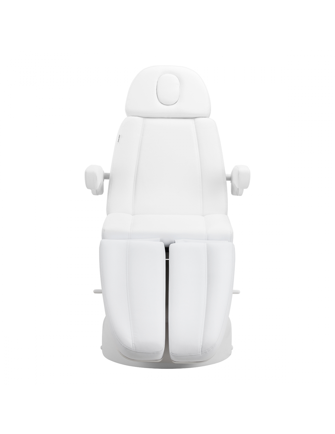 Szerokie siedzisko zapewnia wygodę nawet podczas długotrwałych zabiegów. Łatwe w demontażu, ruchome podłokietniki z możliwością obrotu w zakresie 180° ułatwiają klientowi zajęcie miejsca na fotelu oraz zapewniają swobodny dostęp osobie wykonującej usługę. Fotel wyposażono również w regulowany zagłówek, który gwarantuje stabilne podparcie głowy i dodatkowy komfort, zwłaszcza przypadku wyższych użytkowników.