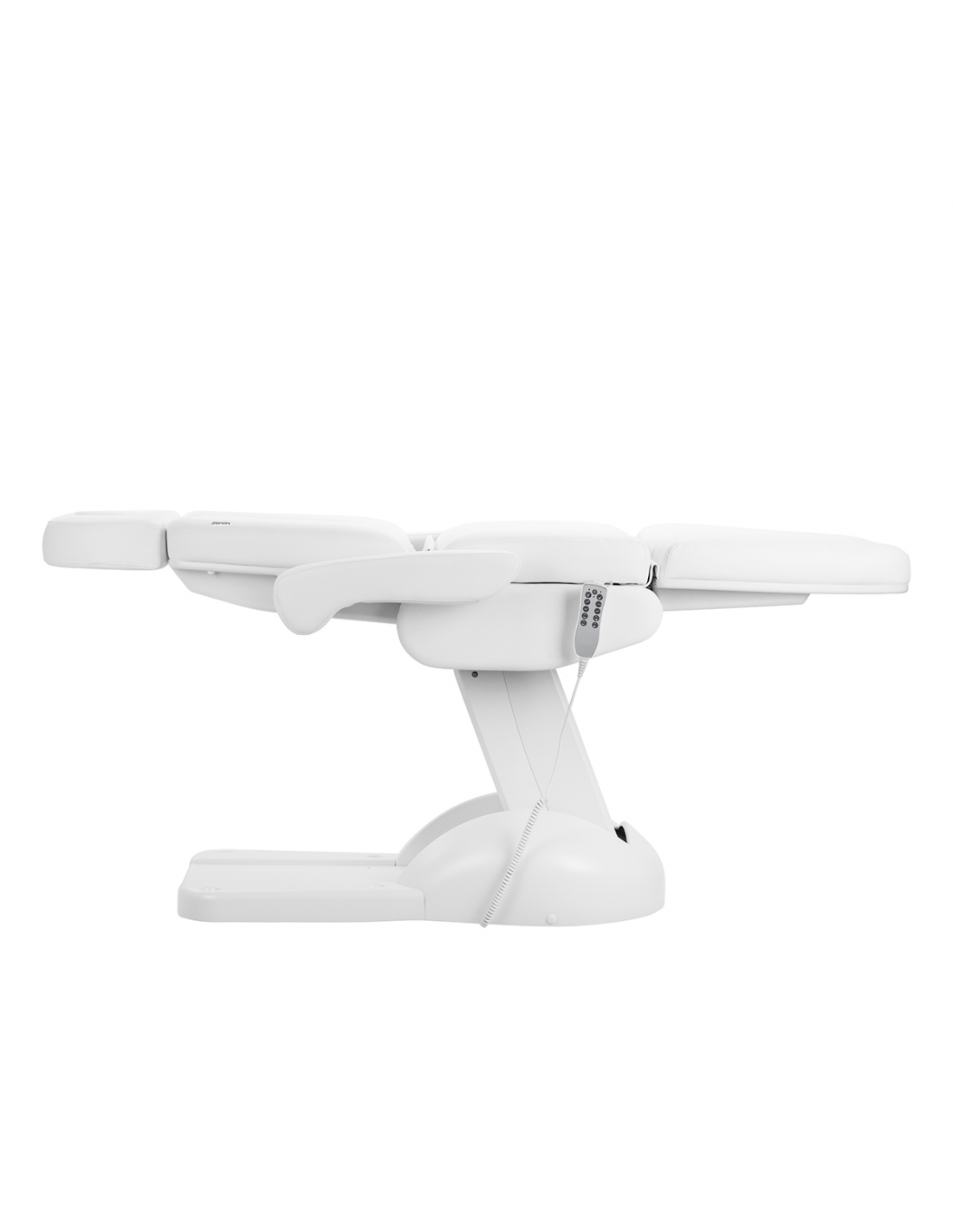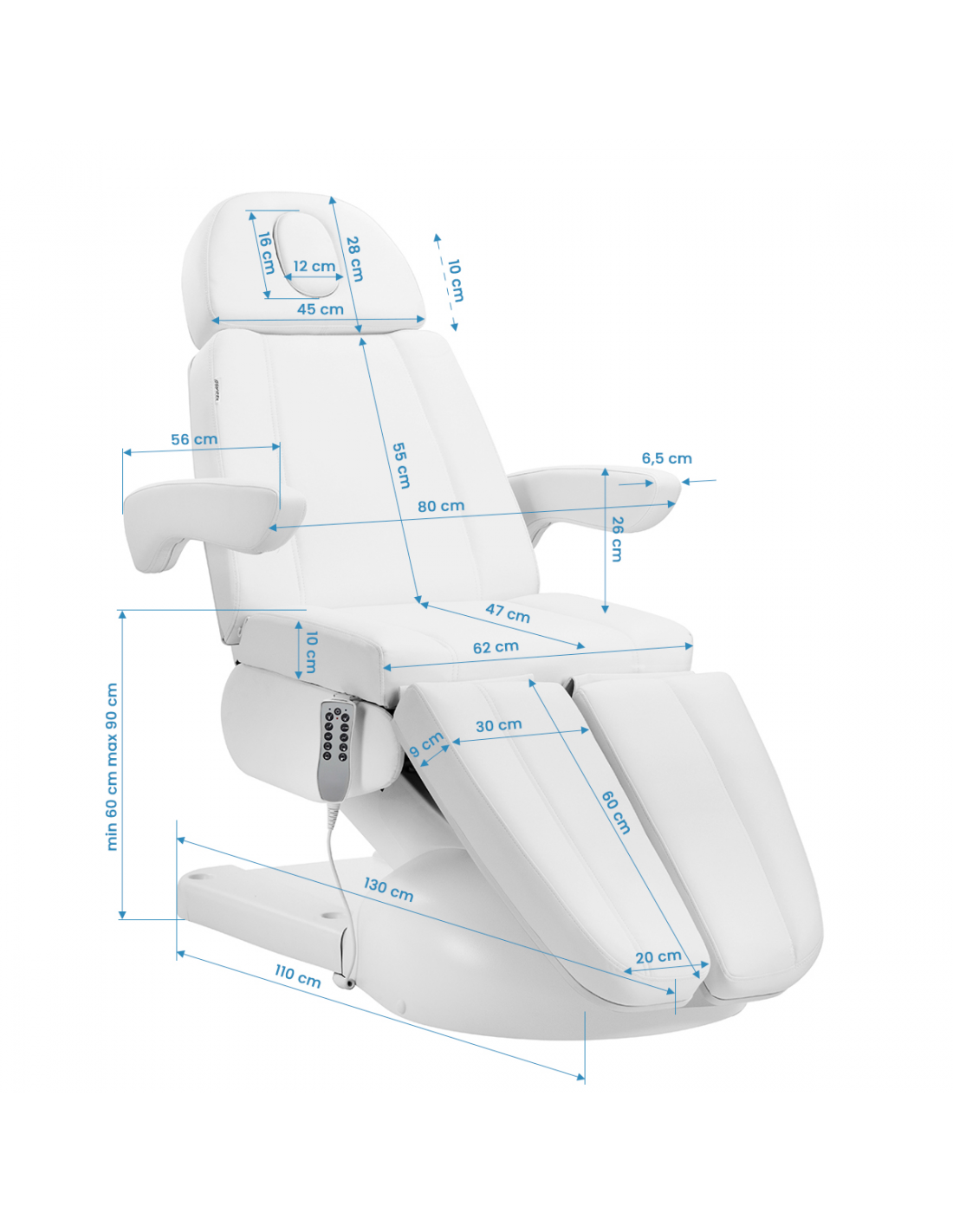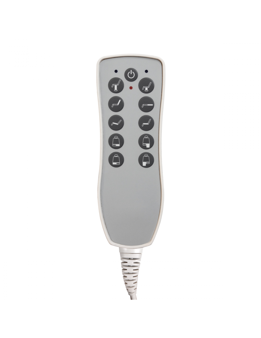 Sterowanie za pomocą pilota przewodowego pozwala na precyzyjne ustawienie fotela w pięciu płaszczyznach: regulacji wysokości, kąta nachylenia oparcia, ustawienia obu części podnóżka oraz kołyski. Taki zakres regulacji umożliwia dopasowanie pozycji do rodzaju wykonywanego zabiegu – zarówno pod względem komfortu klienta, jak i ergonomii pracy specjalisty. Dla wygody użytkowania pilot można zawiesić na uchwytach umieszczonych po obu stronach siedziska.