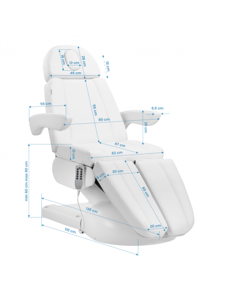 Wysokość siedziska regulowana jest w zakresie od 60 cm do 90 cm, co umożliwia komfortowe dopasowanie pozycji do wzrostu zarówno klienta, jak i osoby wykonującej zabieg. Przy pełnym rozłożeniu fotel osiąga długość 2 metrów, zapewniając wygodne podparcie ciała – również podczas zabiegów wymagających pozycji leżącej. Dzięki takim parametrom sprzęt sprawdzi się przy różnorodnych zabiegach, zarówno pielęgnacyjnych jak i specjalistycznych, gwarantując ergonomię pracy oraz wysoki standard obsługi.