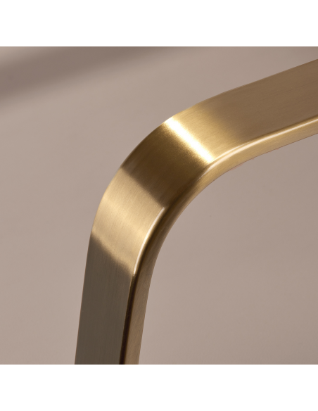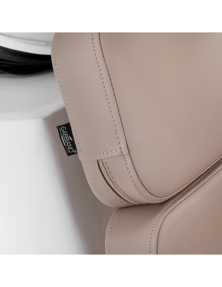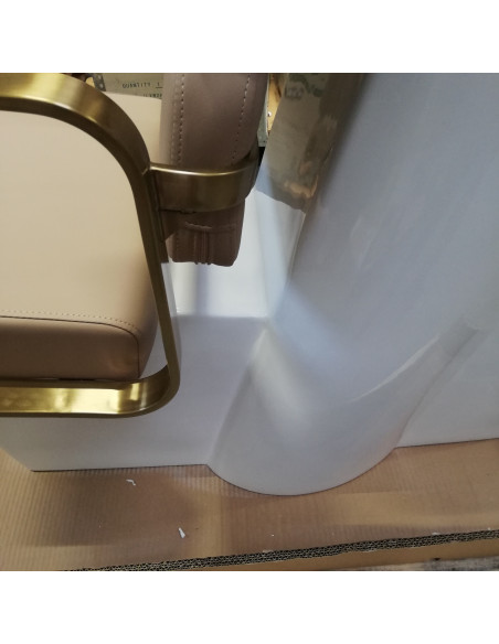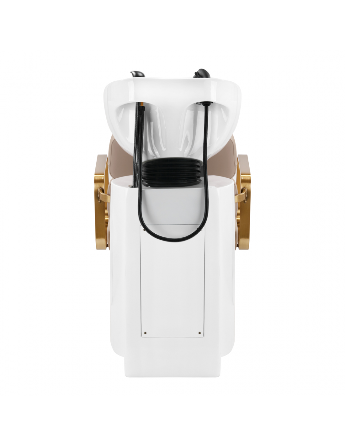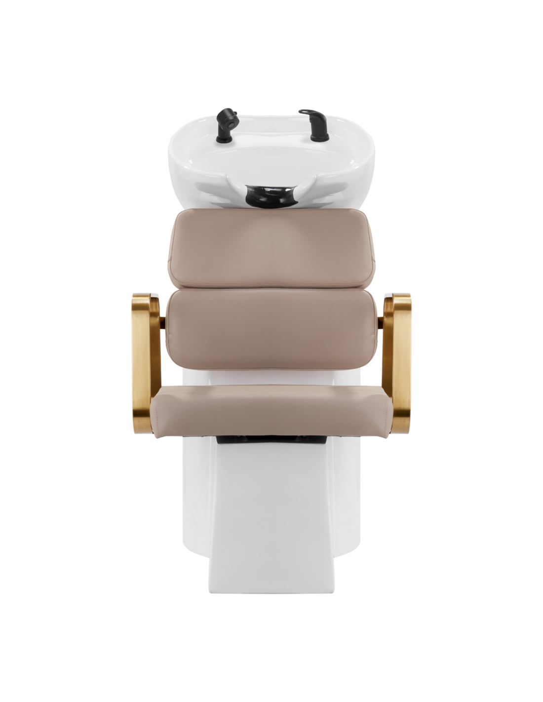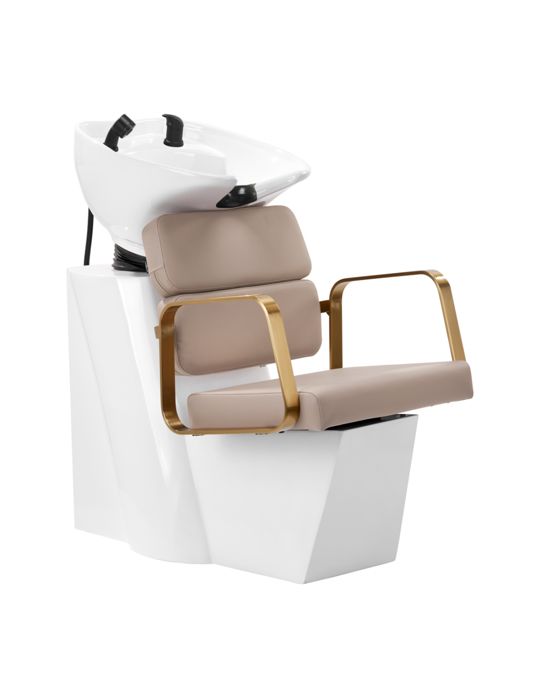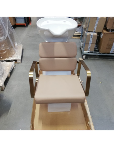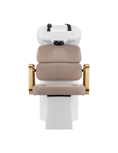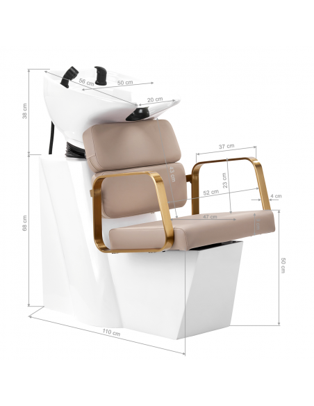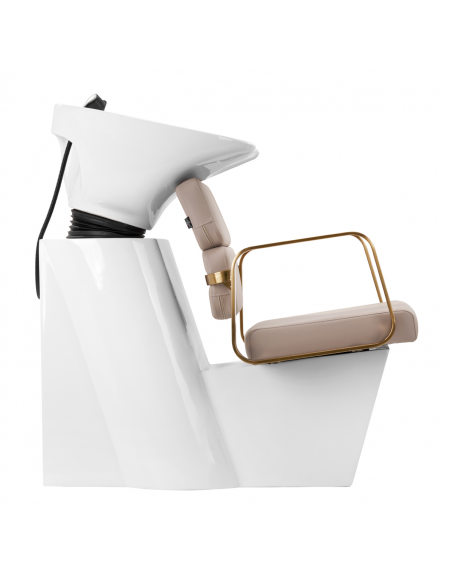Wyprofilowany fotel zapewnia odpowiednie wsparcie lędźwi, a co za tym idzie wysoki komfort użytkowania. Metalowe podłokietniki w odcieniach złota o geometrycznym kształcie pozwalają na prawidłowe ułożenie barków klienta. Wypełnienie z trwałej, odpornej na odkształcenia pianki oraz obicie wykonane z przyjemnej w dotyku skóry syntetycznej w odcieniach beżu zapewniają trwałość mebla, łatwość czyszczenia i komfortowe użytkowanie przez długi czas. Oryginalny, elegancki wygląd myjni nadaje wnętrzom niepowtarzalnego wyrazu. W zestawie znajduje się kompletna armatura w odcieniach czerni, w tym bateria, słuchawka prysznicowa oraz dedykowane węże, aby zapewnić kompletny zestaw narzędzi do pracy.
