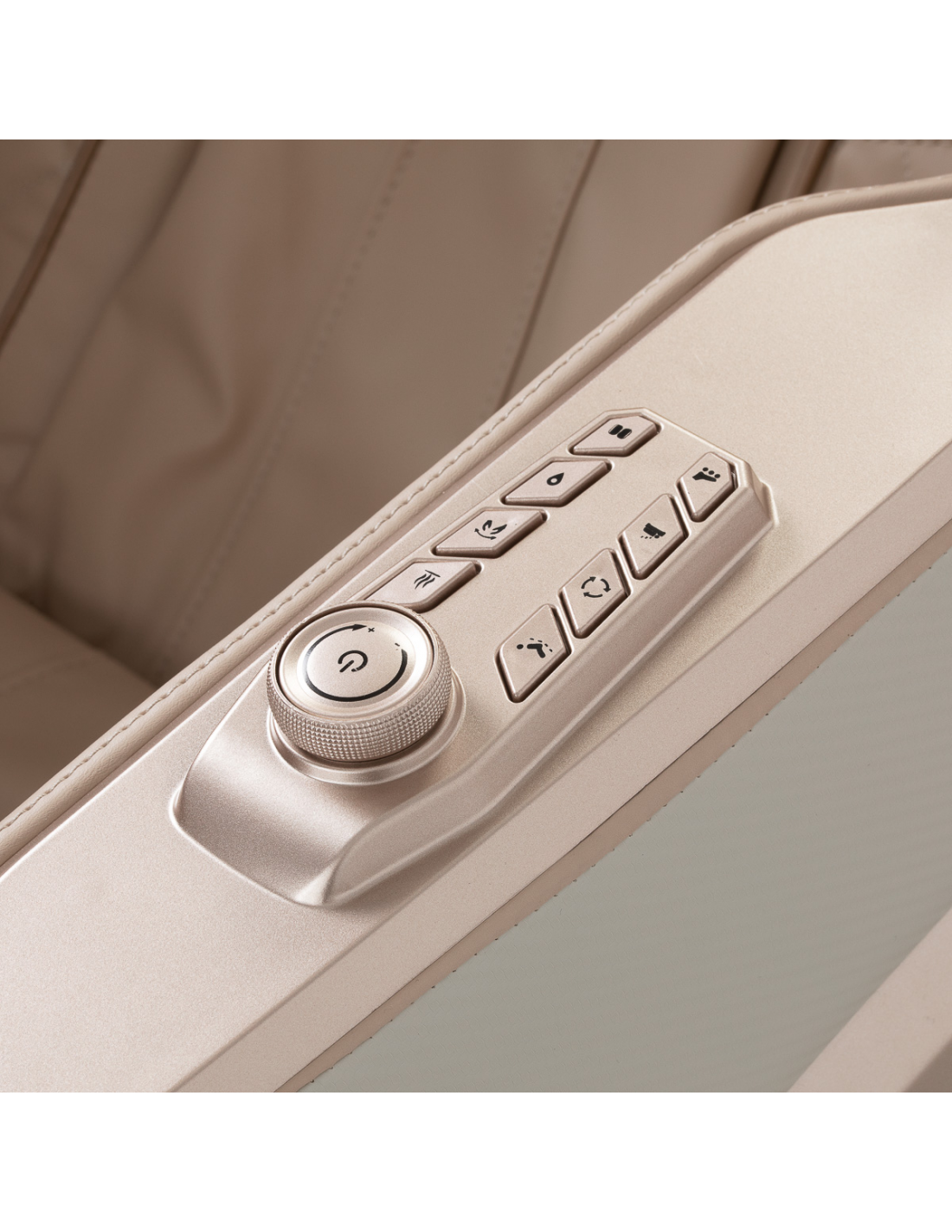 Dla jeszcze większej wygody fotel wyposażono w dodatkowy zestaw przycisków sterujących umieszczonych na lewym podłokietniku. Wbudowany podręczny pilot umożliwia szybki dostęp do najważniejszych funkcji bez konieczności sięgania po główny panel. Użytkownik może z łatwością zmieniać rodzaj masażu, uruchamiać masaż stóp oraz aktywować funkcję Zero Gravity – wszystko z myślą o maksymalnym komforcie i relaksie.