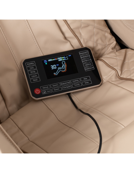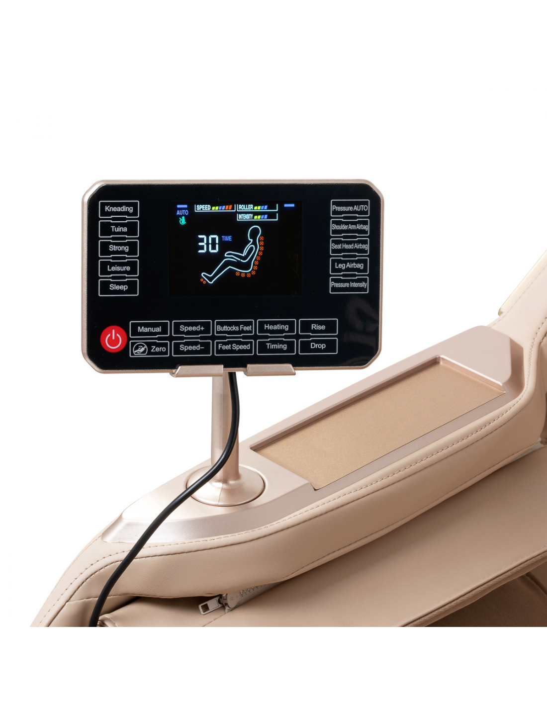 Przejrzysty panel sterowania z czytelnym ekranem LCD zapewnia intuicyjną obsługę fotela. Może być wygodnie umieszczony w uchwycie na prawym podłokietniku lub trzymany w dłoni. Na wyświetlaczu prezentowane są informacje o aktualnie masowanej partii ciała, intensywności masażu, czasie trwania sesji oraz wybranym programie. Za pomocą panelu można łatwo regulować pozycję fotela, wybrać preferowany tryb masażu oraz ustawić czas zabiegu – 15, 20, 25 lub 30 minut.