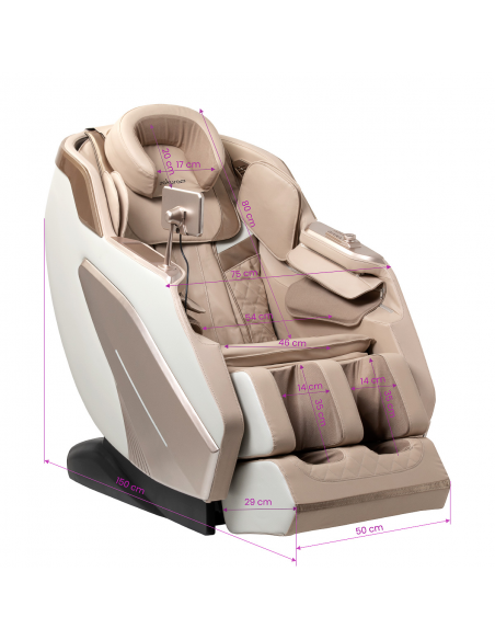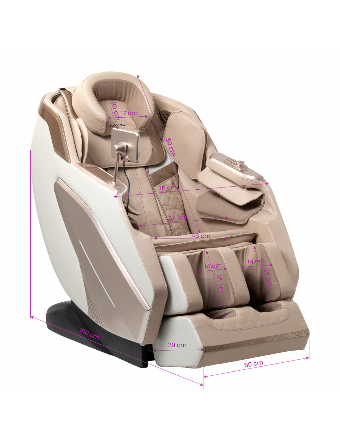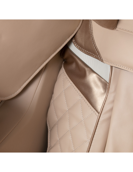 Miękka imitacja skóry w odcieniach beżu zapewnia wyjątkowy komfort użytkowania oraz łatwość w utrzymaniu czystości. Materiał ten jest nie tylko estetyczny, ale również odporny na wilgoć, co podnosi jego funkcjonalność. Zewnętrzne elementy w kolorze rose gold w połączeniu ze strukturalnym wykończeniem w tonacji bieli nadają fotelowi nowoczesny, stylowy wygląd. Kompaktowa forma oraz stonowana kolorystyka sprawiają, że model harmonijnie wpisuje się w różnorodne aranżacje wnętrz. Sakura Prime 108 to doskonały wybór dla osób poszukujących codziennego relaksu – zwłaszcza po intensywnym dniu lub wymagającym wysiłku fizycznym.