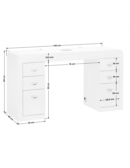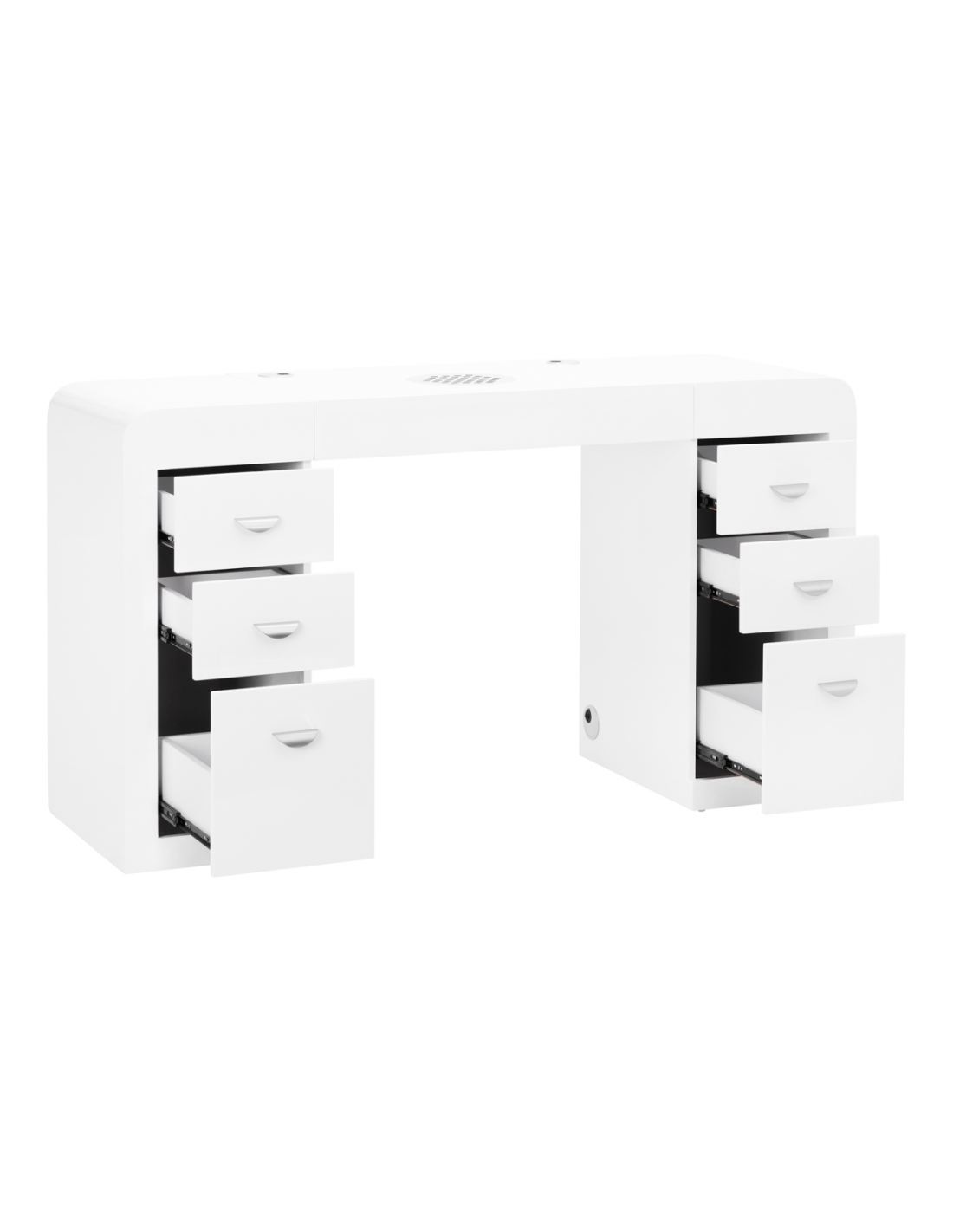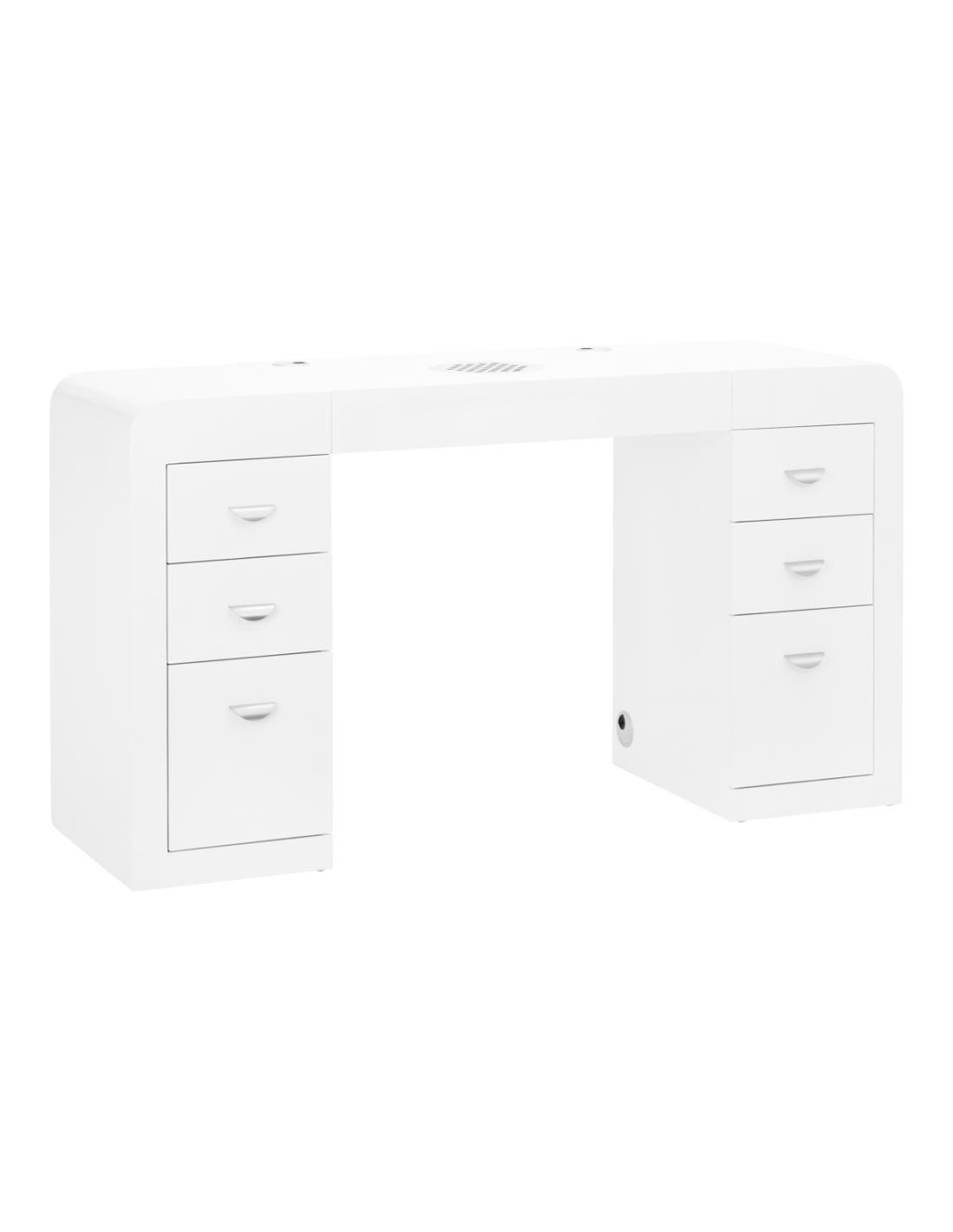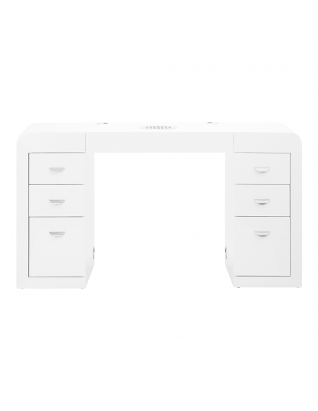 Biurko kosmetyczne z pochłaniaczem - bardzo funkcjonalny mebel do salonów kosmetycznych który łączy w sobie trzy funkcje: biurko, pochłaniacz pyłów i szafka z szufladami. Mebel idealnie komponujący się z wyposażeniem nowocześnie urządzonych pomieszczeń. Mebel został specjalnie zaprojektowany w taki sposób aby maksymalnie ułatwić pracę oraz zmniejszyć problem wystających kabli ( od lampek, frezarek, pochłaniaczy itp. ) :