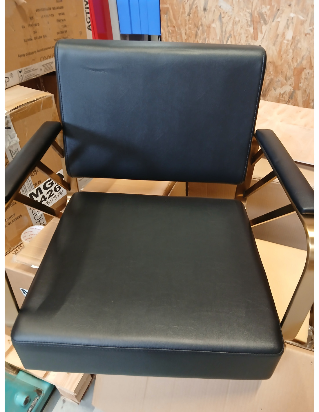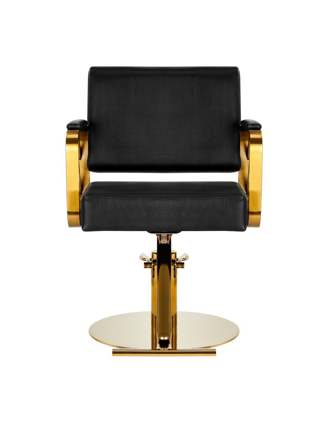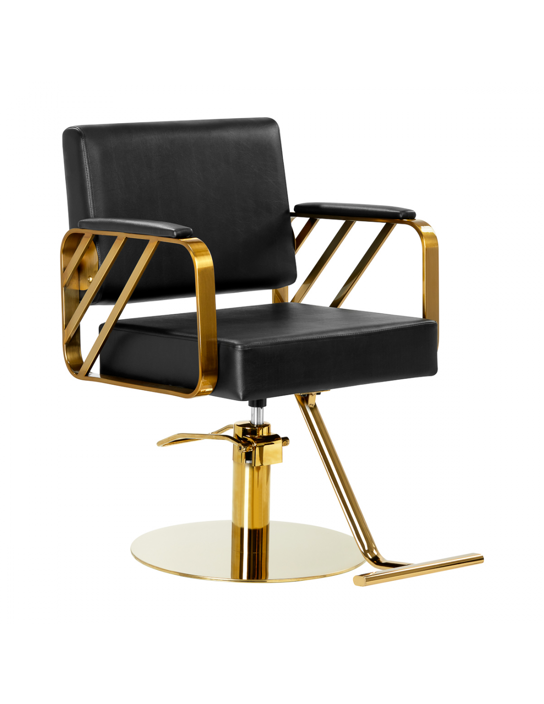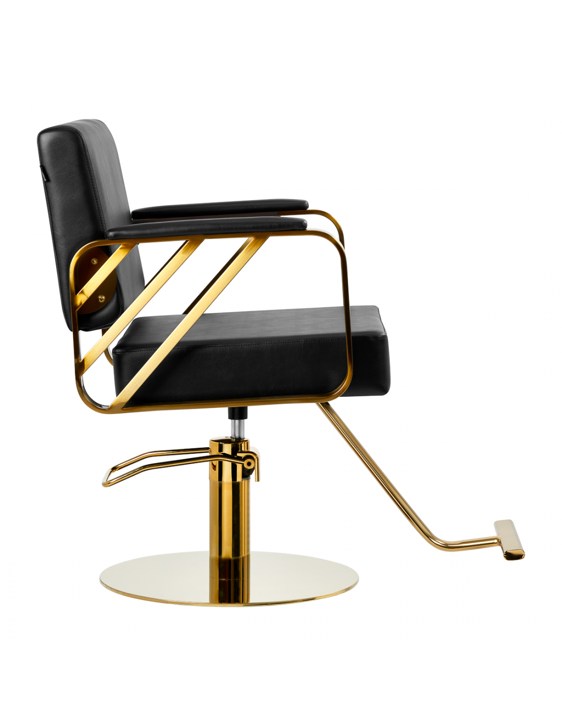 Wygodny mebel wypełniony jest trwałą, odporną na odkształcenia pianką, z kolei obicie wykonane jest z przyjemnej w dotyku skóry syntetycznej w odcieniach czerni. Zastosowane materiały zapewniają komfortowe użytkowanie mebla przez długi czas i sprawiają, że sprzęt jest odporny na wilgoć, wytrzymały oraz łatwy do czyszczenia. Ozdobne, geometryczne metalowe elementy w odcieniach złota na bokach fotela nadają meblowi wyraz ponadczasowej elegancji. Fotel fryzjerski Gabbiano B217 wyróżnia design, który nadaje mu wyjątkowy charakter i sprawia, że fotel będzie doskonale prezentować się w wielu eleganckich salonach.