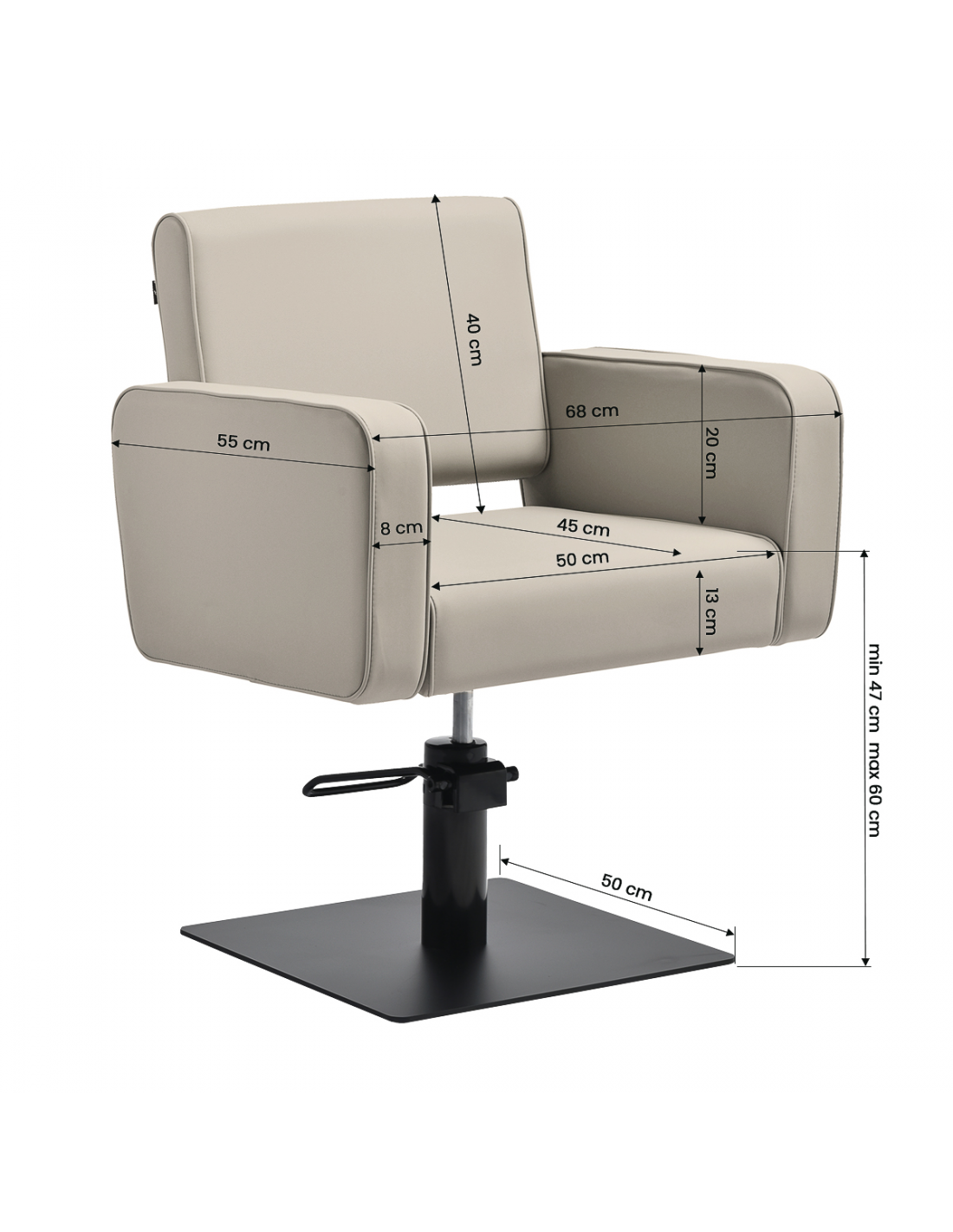 Trwały podnośnik hydrauliczny pozwala na płynną regulację wysokości siedziska w zakresie od 47 do 60 cm – również gdy klient znajduje się na fotelu. Dzięki temu praca staje się bardziej ergonomiczna, a pozycję można łatwo dopasować zarówno do wzrostu klienta, jak i fryzjera. Wygodne oparcie zapewnia stabilne podparcie pleców i ułatwia przyjęcie komfortowej pozycji, co jest szczególnie istotne podczas długich zabiegów, zwiększając komfort i satysfakcję klienta.