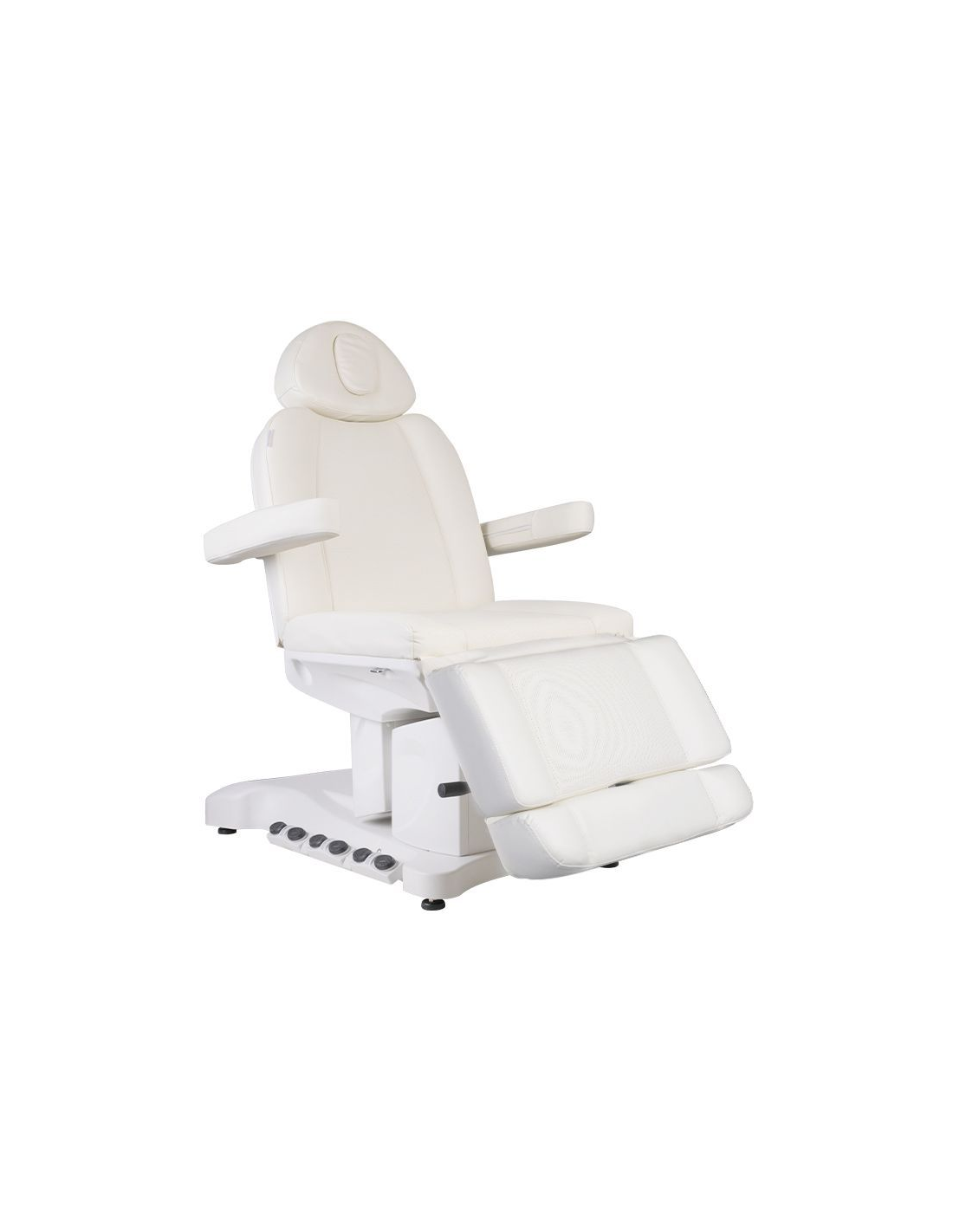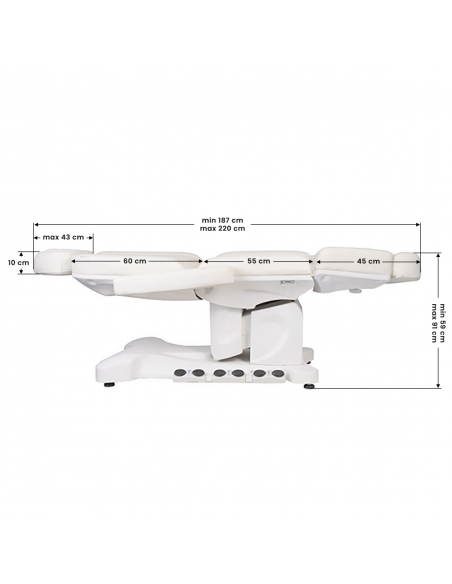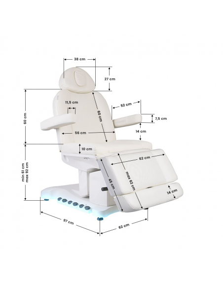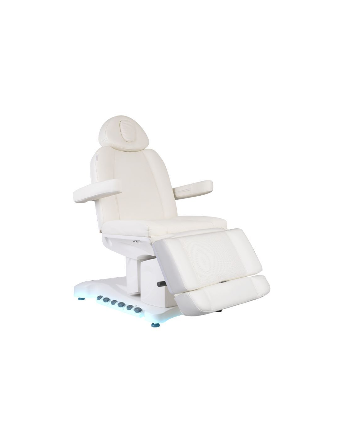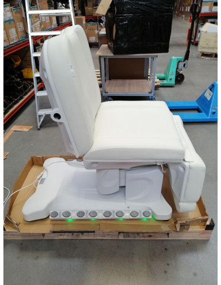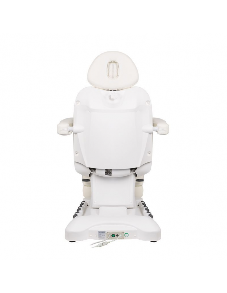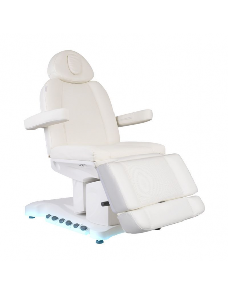 Wyjątkowy fotel kosmetyczny elektryczny idealnie nadający się do gabinetów kosmetycznych oraz salonów SPA. Dzięki niezależnym silnikom umożliwia regulację fotela w 3 płaszczyznach za pomocą pilota i przełączników nożnych dając możliwość komfortowego przeprowadzenia zabiegów na twarz oraz ciało. Używając pilota możemy korzystać z zaprogramowanych ustawień oraz uruchamiać funkcję HOT czyli podgrzewanie oraz pompowanie oparcia. W fotelu została zastosowana tapicerka perforowana niespotykana w innych fotelach oraz kolorowe podświetlenie LED podstawy.