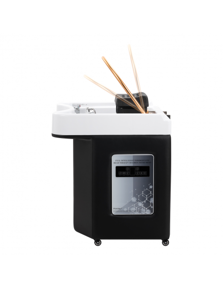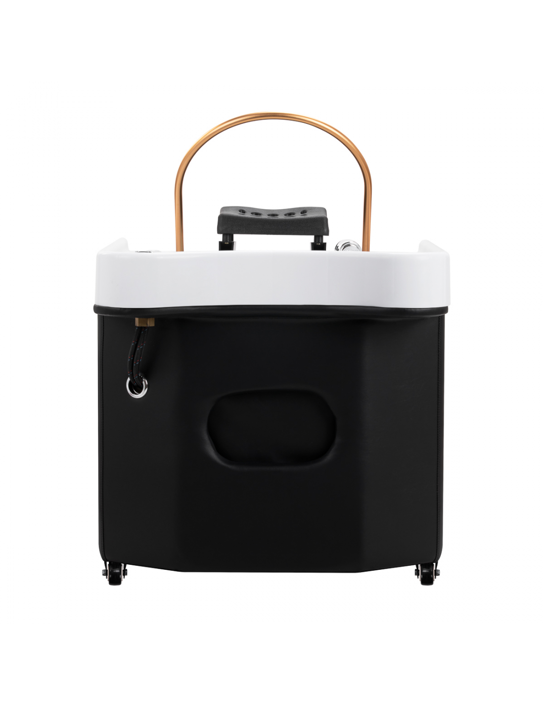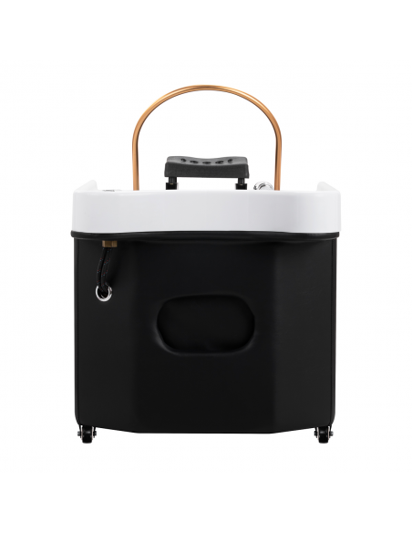 Urządzenie przyciąga wzrok nowoczesną formą i kontrastowym zestawieniem kolorów – eleganckiej bieli z głęboką czernią. Minimalistyczna bryła z zaokrąglonymi krawędziami prezentuje się stylowo i profesjonalnie, doskonale wpisując się w wystrój nowoczesnych salonów kosmetycznych oraz gabinetów SPA. Myjka wyposażona jest w kółka z możliwością blokady, co zapewnia wygodę transportu oraz stabilność w trakcie użytkowania. To idealne rozwiązanie do mniejszych przestrzeni – jedno mobilne urządzenie może obsługiwać kilka stanowisk zabiegowych, co czyni je niezwykle funkcjonalnym i ekonomicznym wyborem.