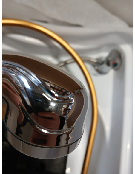 Myjnia jest wyposażona w baterię z mieszaczem, co umożliwia łatwe dopasowanie temperatury do preferencji klienta. Dedykowane miejsce na słuchawkę natryskową ułatwia pracę, a chromowany korek ze specjalnym sitkiem pozwala na kontrolę przepływu wody oraz utrzymanie wysokich standardów higieny w salonie. Przyłącze wody ukryto wewnątrz obudowy za osłoną z elastycznego materiału, co pozwala estetycznie zamaskować instalację hydrauliczną i zachować spójny, profesjonalny wygląd urządzenia.
