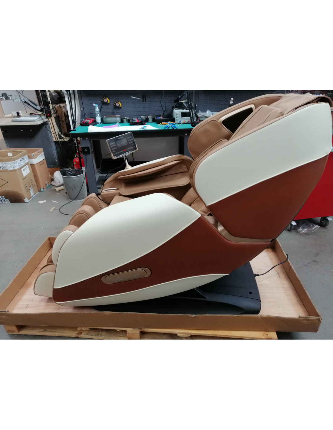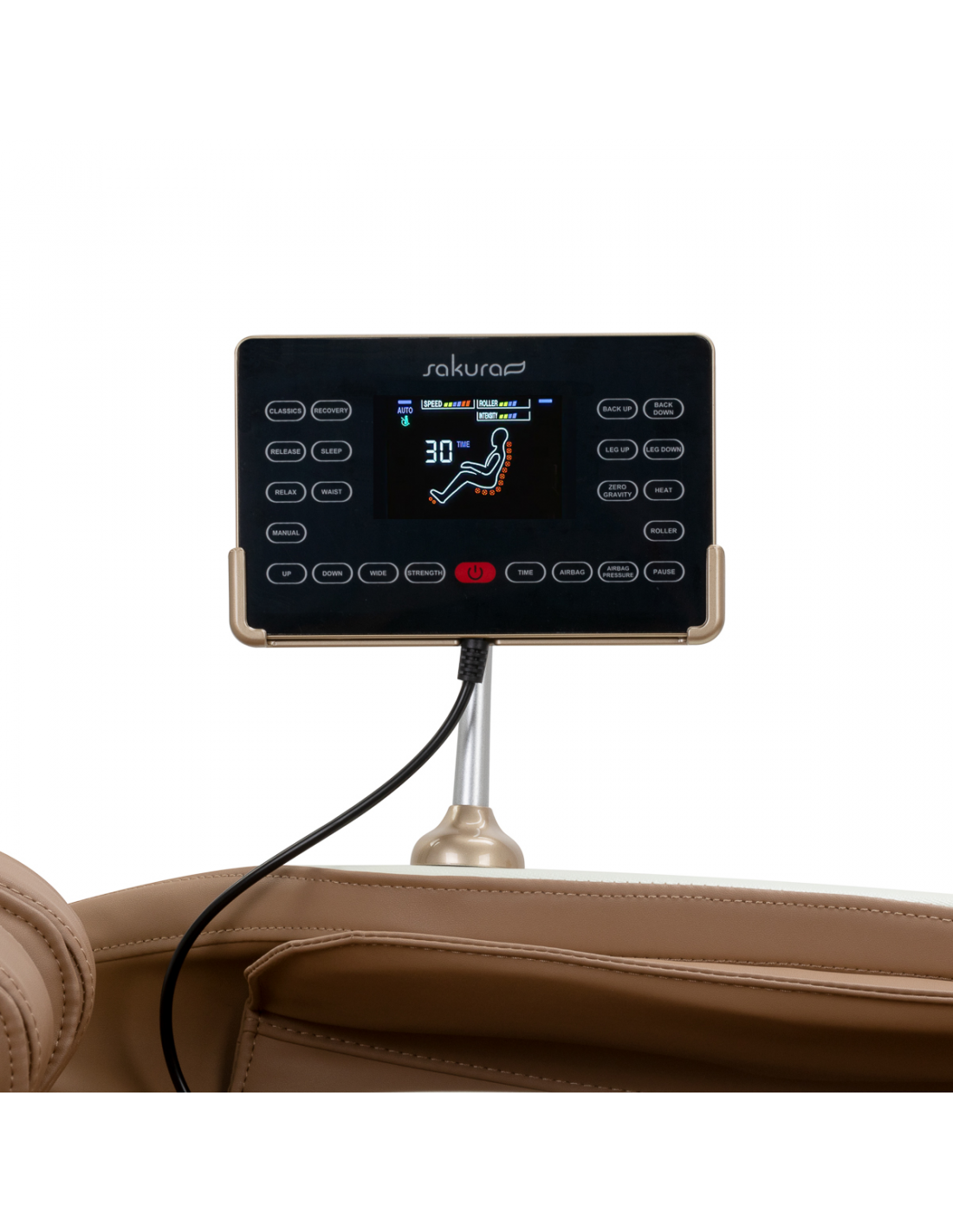 Intuicyjny panel sterowania sprawia, że obsługa fotela jest wyjątkowo prosta i komfortowa. Dla większej wygody można umieścić go w uchwycie na prawym podłokietniku lub trzymać swobodnie w dłoniach. Na czytelnym ekranie LCD wyraźnie prezentowane są wszystkie kluczowe informacje – aktualnie masowane partie ciała, intensywność masażu, czas trwania zabiegu oraz wybrany program. Za pomocą panelu można z łatwością wybierać spośród dostępnych trybów masażu, dostosowywać ustawienia fotela, regulować intensywność działania, a także ustalać czas sesji, który może wynosić 5, 10, 15, 20, 25 lub 30 minut.