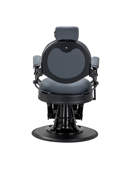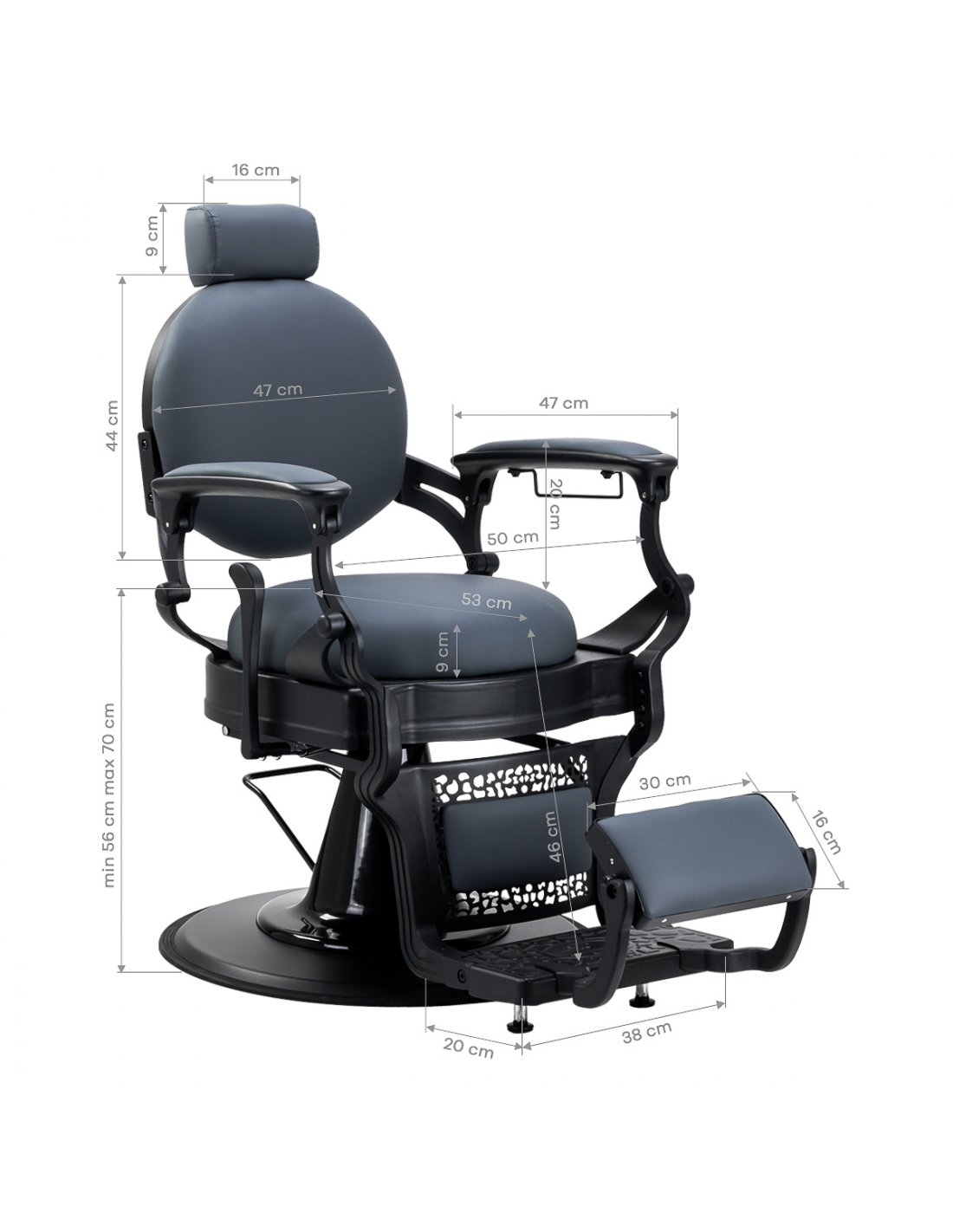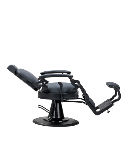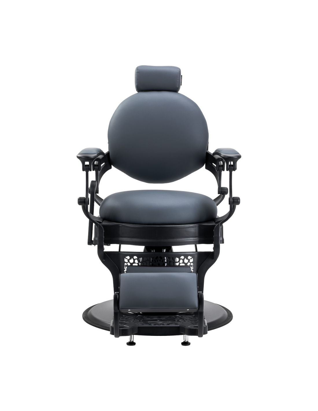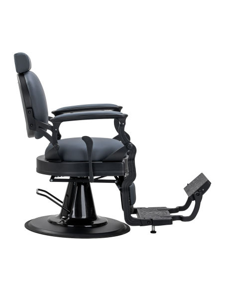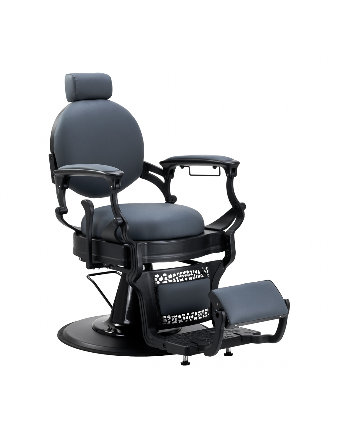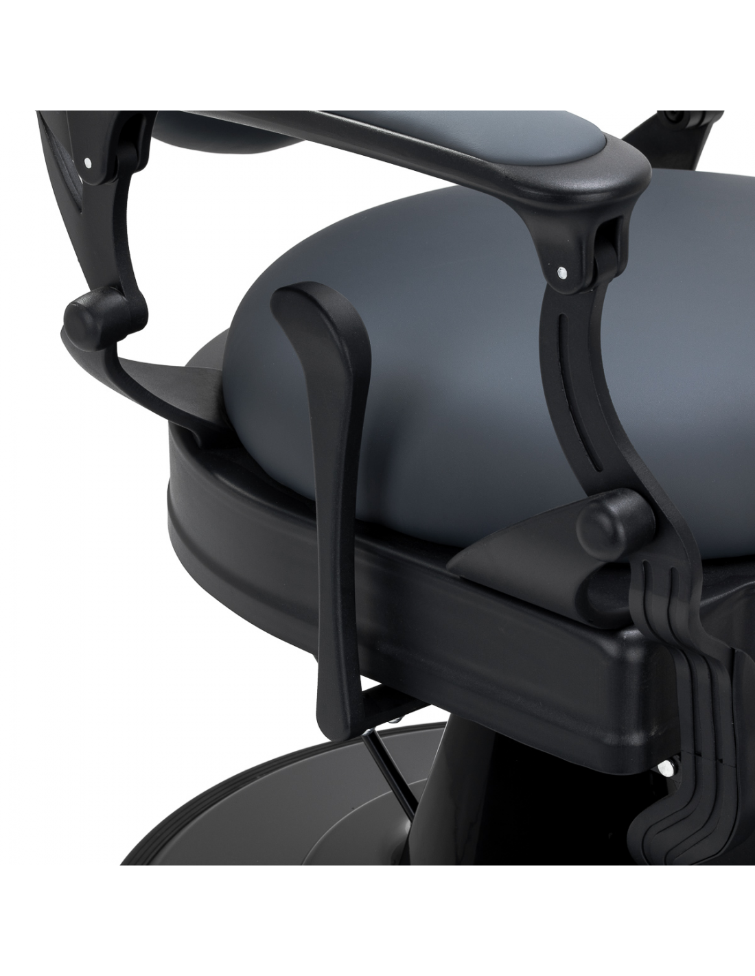 Solidna konstrukcja podstawy zapewnia stabilność oraz wysoki komfort użytkowania. Wypełnienie siedziska z trwałej, odpornej na odkształcenia pianki oraz obicie wykonane z przyjemnej w dotyku skóry syntetycznej o matowym wykończeniu zapewniają trwałość mebla oraz jego komfortowe użytkowanie przez długi czas. Zastosowane materiały sprawiają również, że sprzęt jest odporny na wilgoć, wytrzymały oraz łatwy do czyszczenia. Pokrycie w odcieniach grafitu oraz zdobiony podnóżek nadają mu wyjątkowego charakteru. Fotel o charakterystycznym designie, nawiązującym do stylu vintage, doskonale pasuje do klimatu salonów barberskich, podkreślając ich wyjątkową atmosferę.