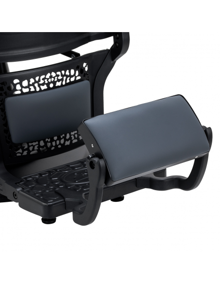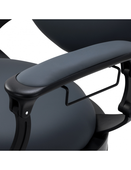 Komfortowe siedzisko wypełnione pianką gwarantuje klientowi wygodę w trakcie różnorodnych usług. Wyprofilowane oparcie pozwala na zajęcie dogodnej pozycji, zapewniając doskonałe wsparcie pleców, co jest istotne szczególnie podczas dłuższych zabiegów. Wyposażenie fotela w mechanizm pełnego obrotu sprawia, że praca staje się bardziej efektywna i wygodna. Tapicerowane podłokietniki umieszczone na odpowiedniej wysokości umożliwiają prawidłowe ułożenie barków klienta – sprawia to, że nie chowa głowy w ramionach ani się nie garbi – znacząco ułatwiając wykonywanie precyzyjnych zabiegów. Uchwyt na ręcznik pod podłokietnikiem znacznie wpływa na efektywność pracy. Otwór pomiędzy oparciem a siedziskiem ułatwia zachowanie czystości w salonie, pozwalając w łatwy sposób wymieść włosy z każdego zakamarka fotela. Usprawnia to przygotowanie stanowiska pracy pomiędzy klientami.