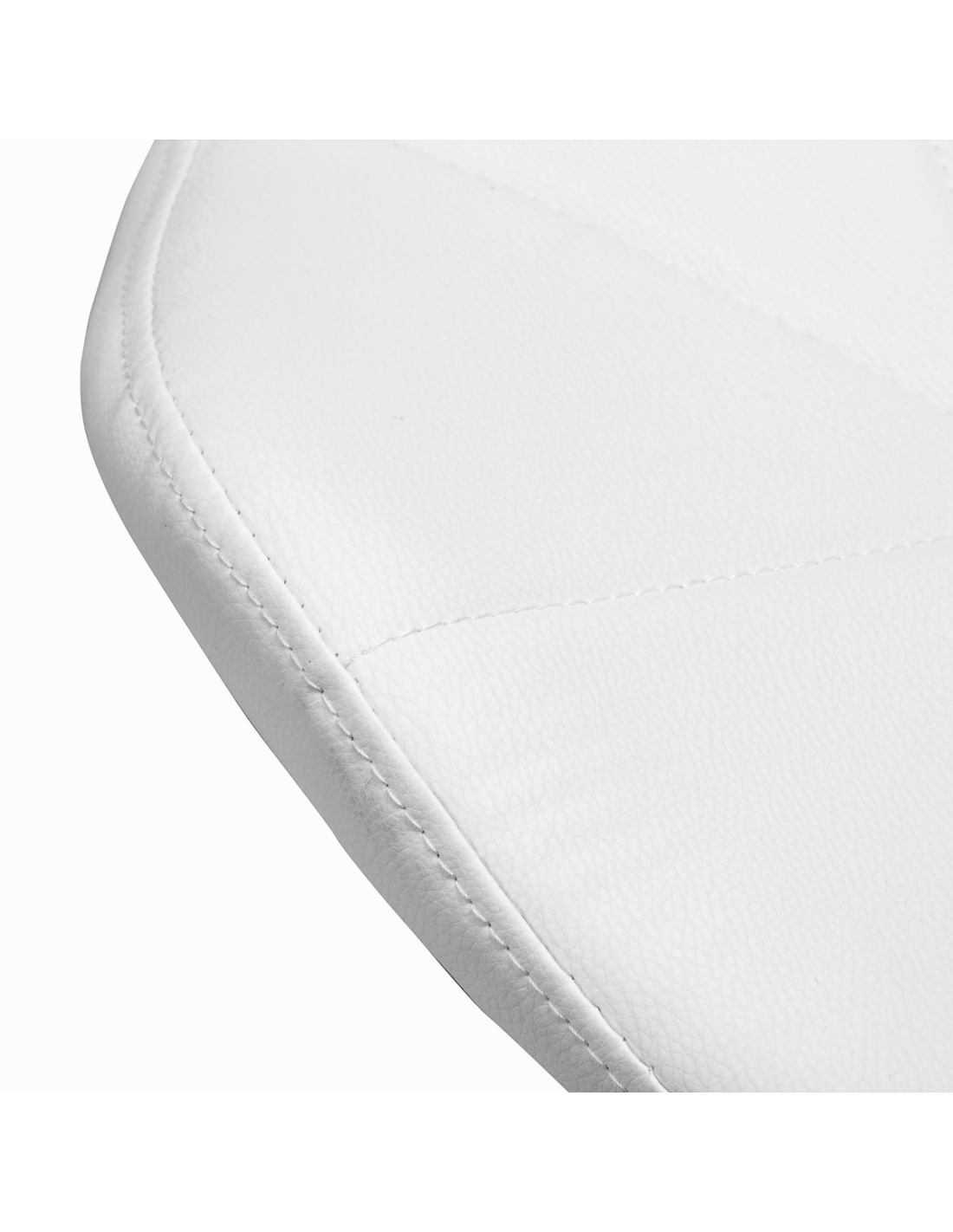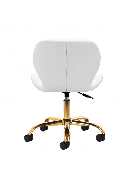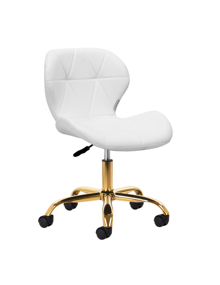 Pięcioramienna podstawa w odcieniach złota wyposażona jest w plastikowe kółka, które zapewniają znaczną mobilność, umożliwiając swobodne przemieszczanie mebla po gabinecie. Siedzisko taboretu zostało obite przyjemną w dotyku imitacją skóry w eleganckim odcieniu bieli. Zastosowany materiał gwarantuje trwałość, odporność na wilgoć oraz łatwość w utrzymaniu czystości. Całość dopełniają stylowe przeszycia, które podkreślają nowoczesny design.