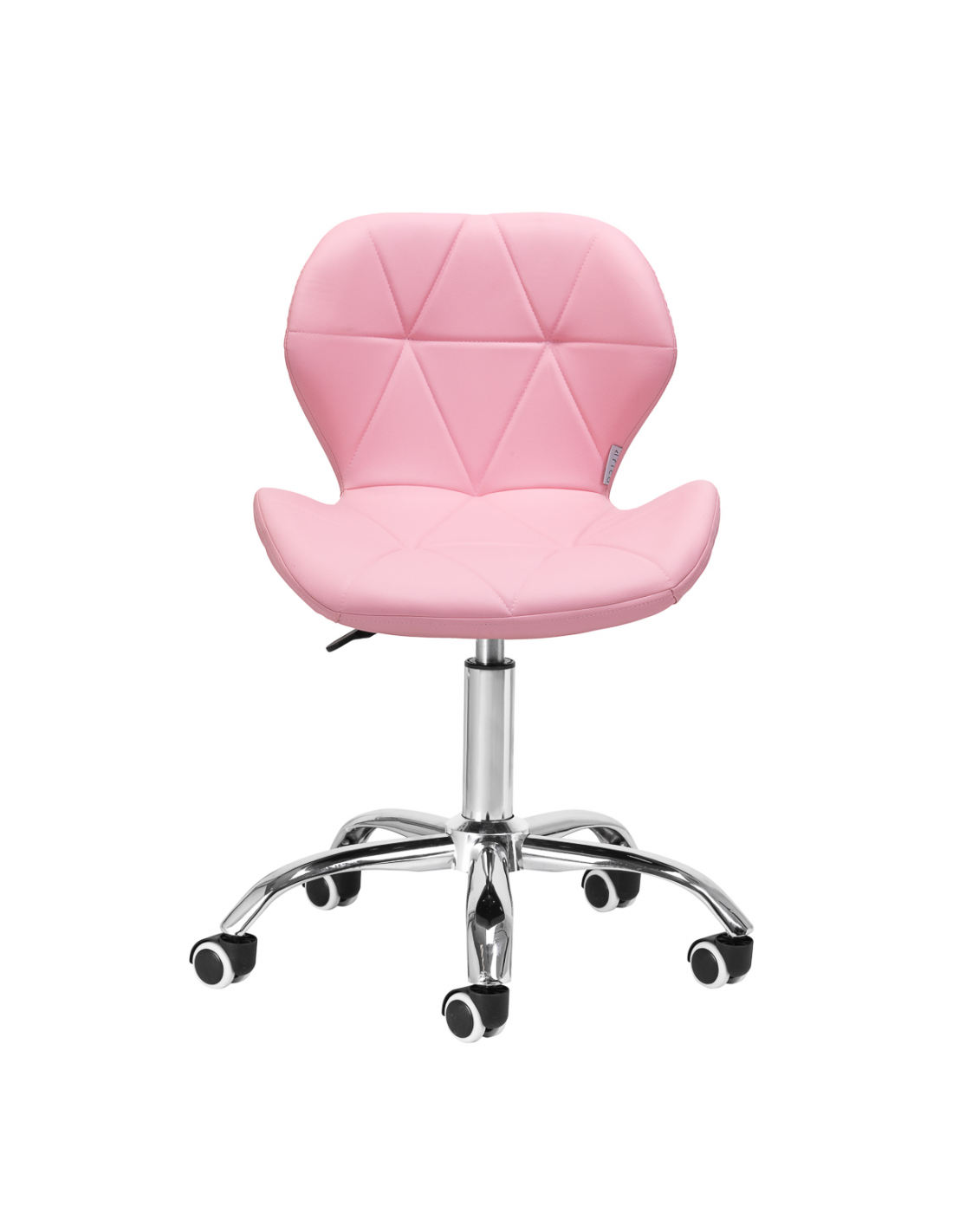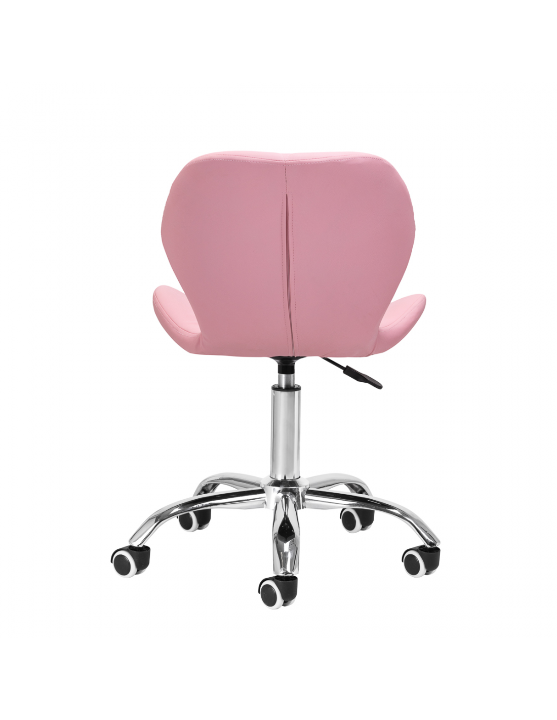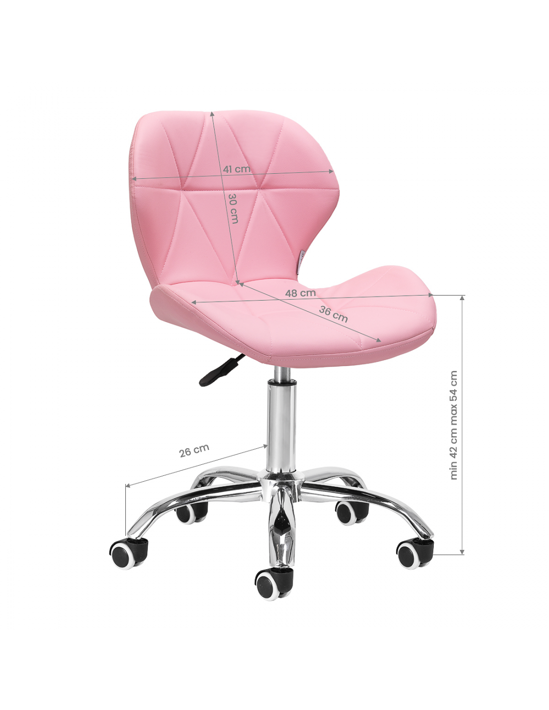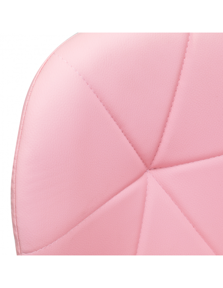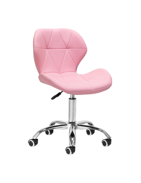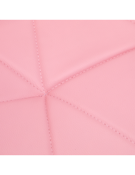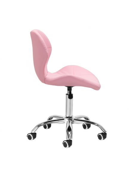 Pięcioramienna podstawa w odcieniach chromu wyposażona jest w gumowane kółka, które zapewniają znaczną mobilność, umożliwiając swobodne przemieszczanie mebla po gabinecie. Siedzisko taboretu zostało obite przyjemną w dotyku imitacją skóry w eleganckim odcieniu różu. Zastosowany materiał gwarantuje trwałość, odporność na wilgoć oraz łatwość w utrzymaniu czystości. Całość dopełniają stylowe przeszycia, które podkreślają nowoczesny design.