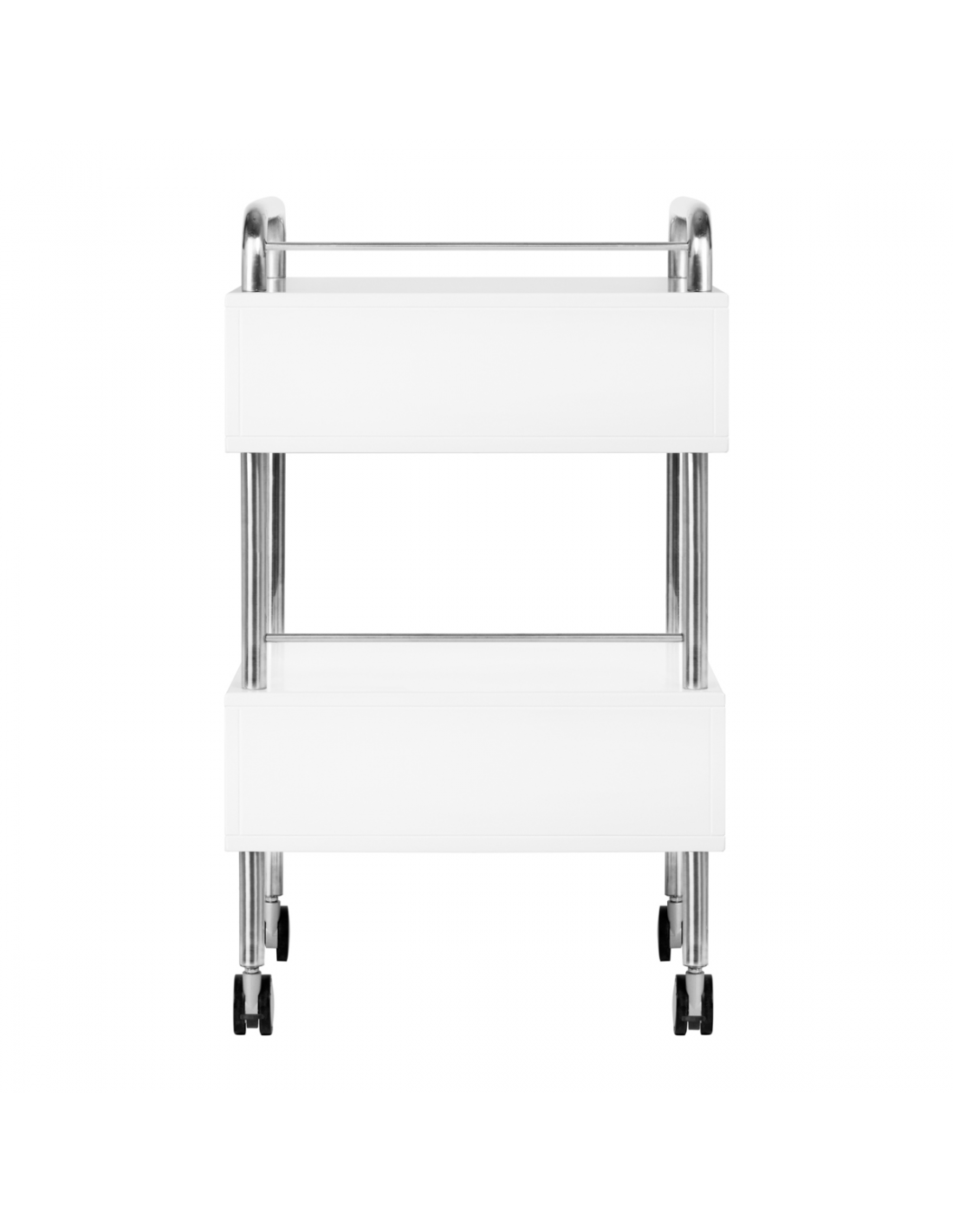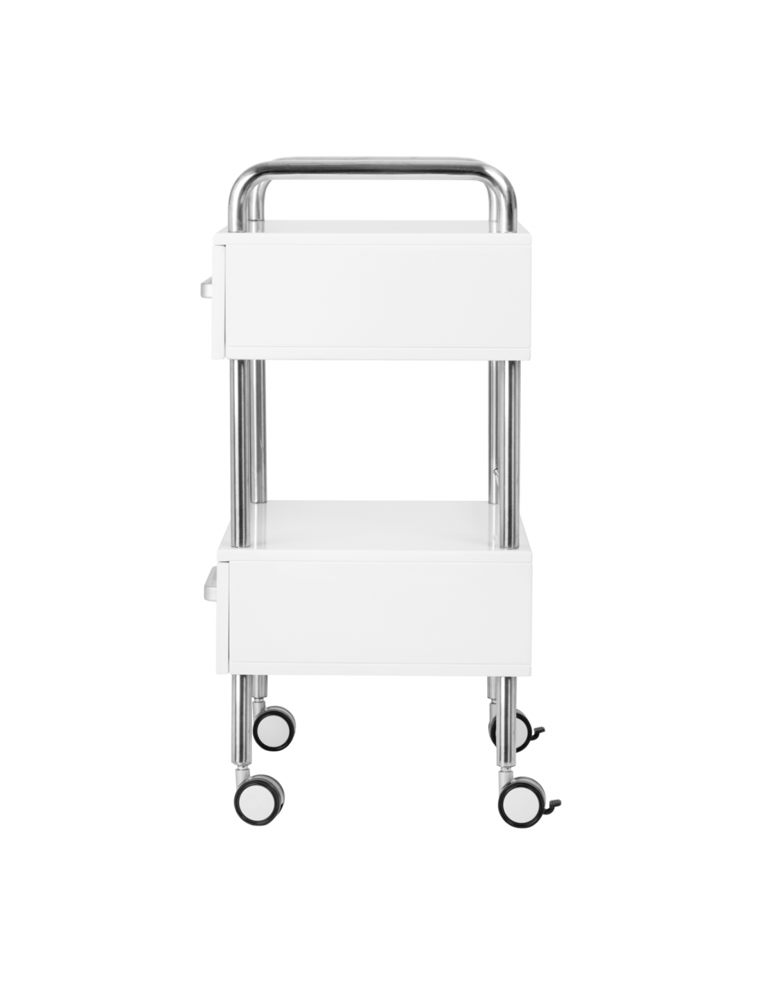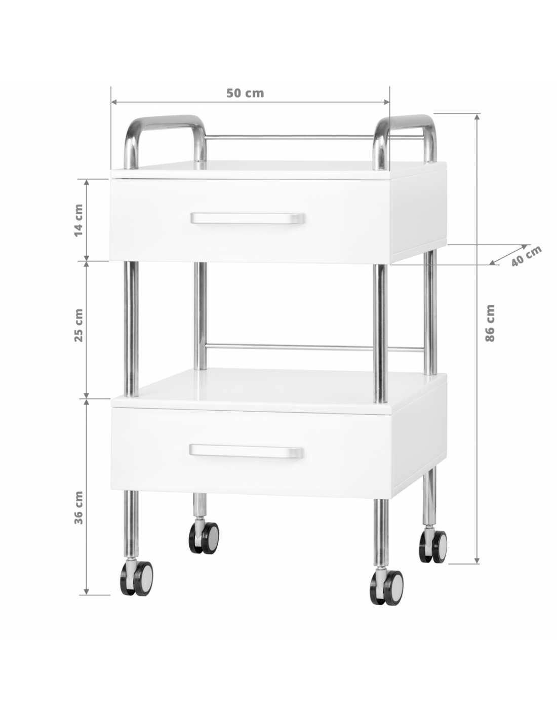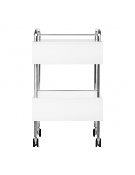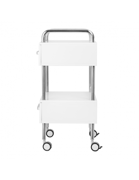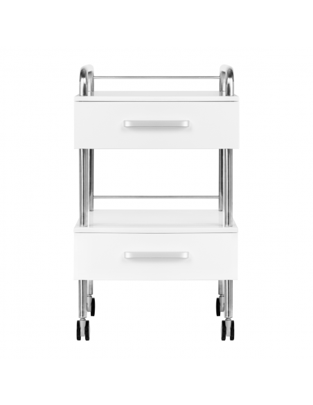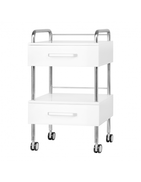 Wysokiej jakości pomocnik podologiczny to funkcjonalny mebel kosmetyczny na kółkach. Dzięki swojej mobilności możesz transportować go do innych pomieszczeń zabiegowych. Pomocnik posiada dwie szuflady na narzędzia, akcesoria oraz półkę na frezarkę podologiczną lub inne urządzenie.