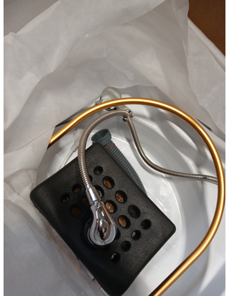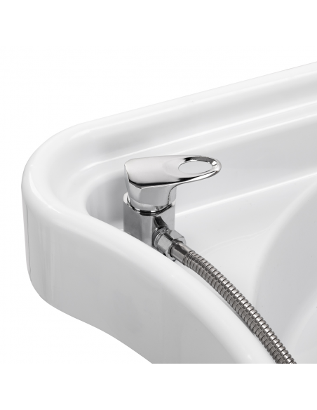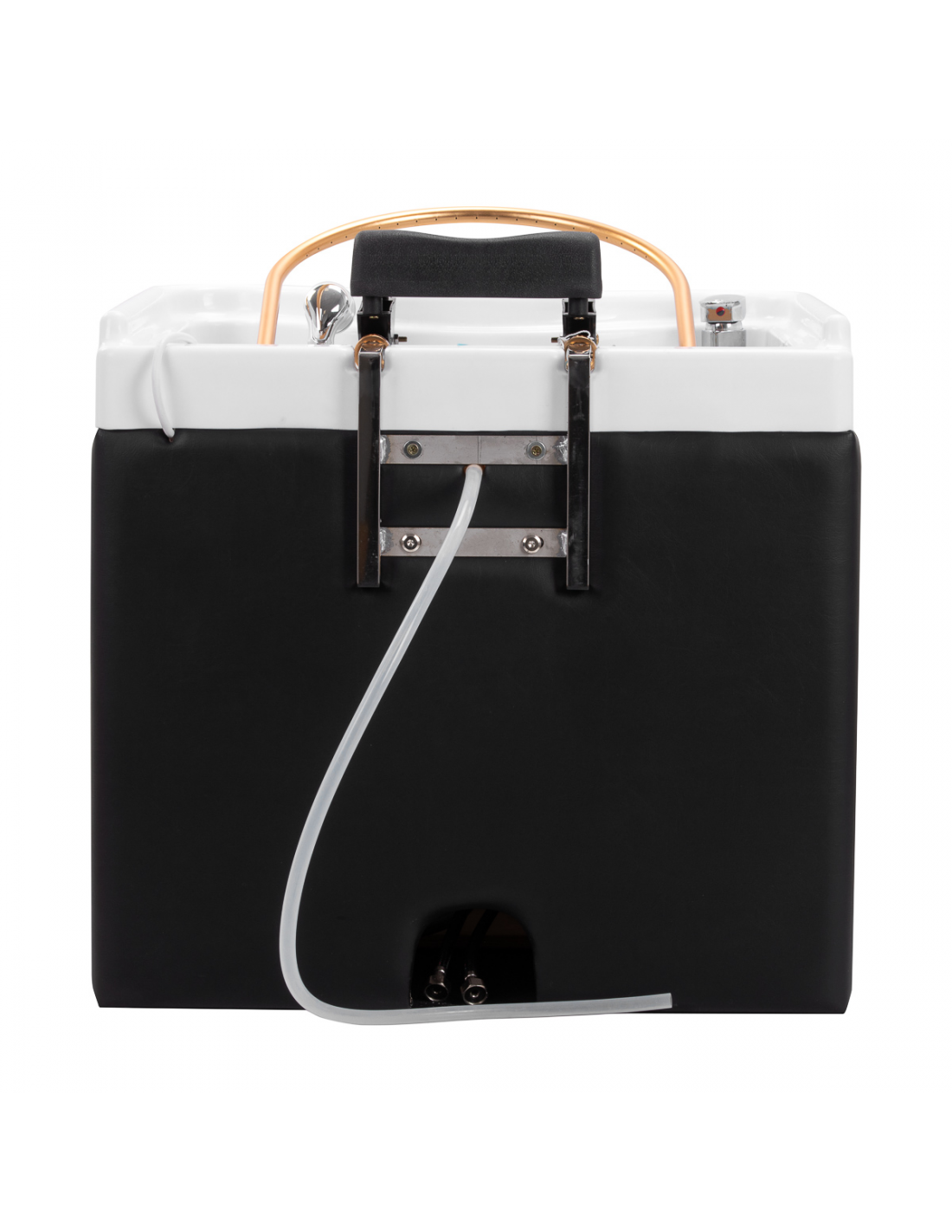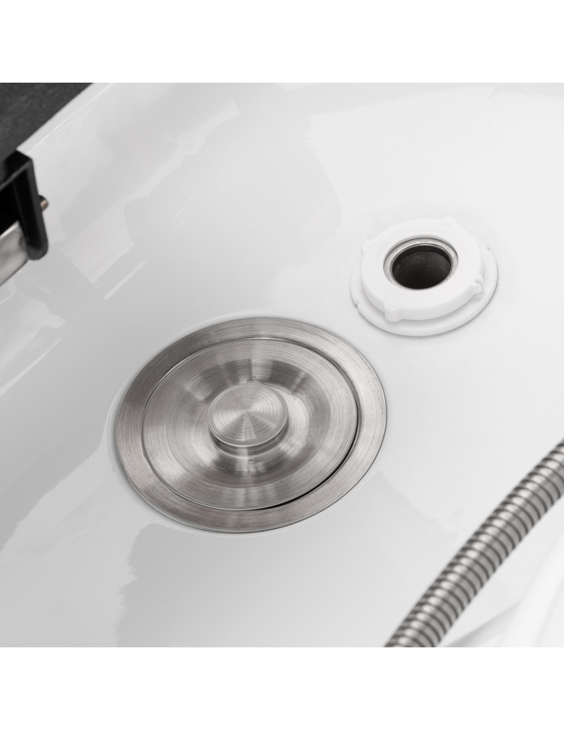 Myjnia jest wyposażona w baterię z mieszaczem, co umożliwia łatwe dopasowanie temperatury do preferencji klienta. Dedykowane miejsce na słuchawkę natryskową ułatwia pracę, a chromowany korek ze specjalnym sitkiem pozwala na kontrolę przepływu wody oraz utrzymanie wysokich standardów higieny w salonie. Przyłącze wody ukryto wewnątrz obudowy za osłoną z elastycznego materiału, co pozwala estetycznie zamaskować instalację hydrauliczną i zachować spójny, profesjonalny wygląd urządzenia.