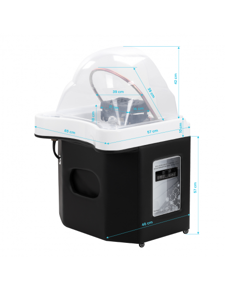 Urządzenie przyciąga wzrok nowoczesną formą i kontrastowym zestawieniem kolorów – eleganckiej bieli z głęboką czernią. Minimalistyczna bryła z zaokrąglonymi krawędziami prezentuje się stylowo i profesjonalnie, doskonale wpisując się w wystrój nowoczesnych salonów kosmetycznych oraz gabinetów SPA. Myjka wyposażona jest w kółka z możliwością blokady, co zapewnia wygodę transportu oraz stabilność w trakcie użytkowania. To idealne rozwiązanie do mniejszych przestrzeni – jedno mobilne urządzenie może obsługiwać kilka stanowisk zabiegowych, co czyni je niezwykle funkcjonalnym i ekonomicznym wyborem.